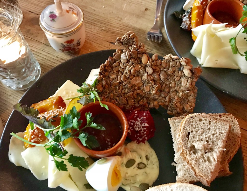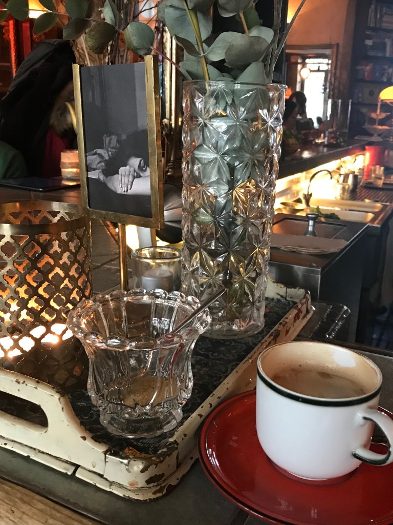 Wir bestellten ein reichhaltiges vegetarisches Frühstück – mit selbstgebackenem Brot und -gemachten Fruchtaufstrich, gebratenem Gemüse, Käse und Ei. Der Kaffee ist lecker, könnte etwas größer sein ;-). Es gibt drei Frühstücke zur Auswahl: Wurst/ Käse, nur Käse oder vegan. Und natürlich Eier in diversen Varianten. Ansonsten enthält die Karte die üblichen Speisen und Getränke eines gut sortierten Cafés. Ach ja, auf der Website wird mit dem selbstgebackenen Kuchen geworben. Das werden wir demnächst wohl mal ausprobieren.