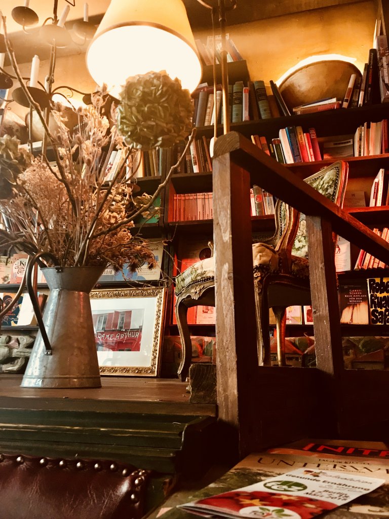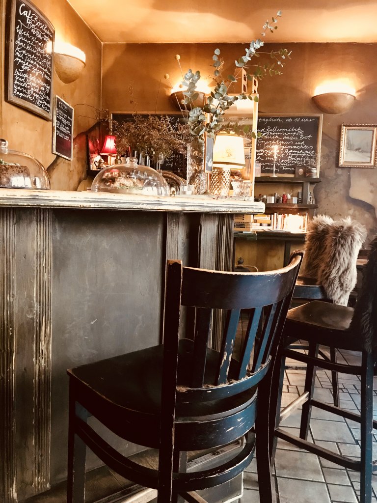 Ja, genau so stelle ich mir ein gemütliches Café vor. Genau so sollte mein gemütliches Café aussehen. Herzlich willkommen in der Bösen Buben Bar. Wir werden super freundlich in Empfang genommen. Leider ist gerade kein Tisch frei (wir kommen zur Frühstücks-High-Season, Sonntag 11.30 Uhr), aber wir können gern an der Bar warten und normalerweise wird so in 10-20 Minuten ein Tisch frei. Klasse – Bestnoten allein schon für den aufmerksamen Service! Wir kamen nämlich gerade aus einem anderen Café wo wir genau diesen Service vermisst hatten. Es ist urig und doch wieder stylisch. Alte Möbel, die Bar ist mit Fliesen gekachelt. Accessoires aus verschiedenen Jahrzehnten geben der Bar einen leicht verruchten Hauch. Die Wände sind voll mit Bücherregalen – wir fühlen uns total wohl!