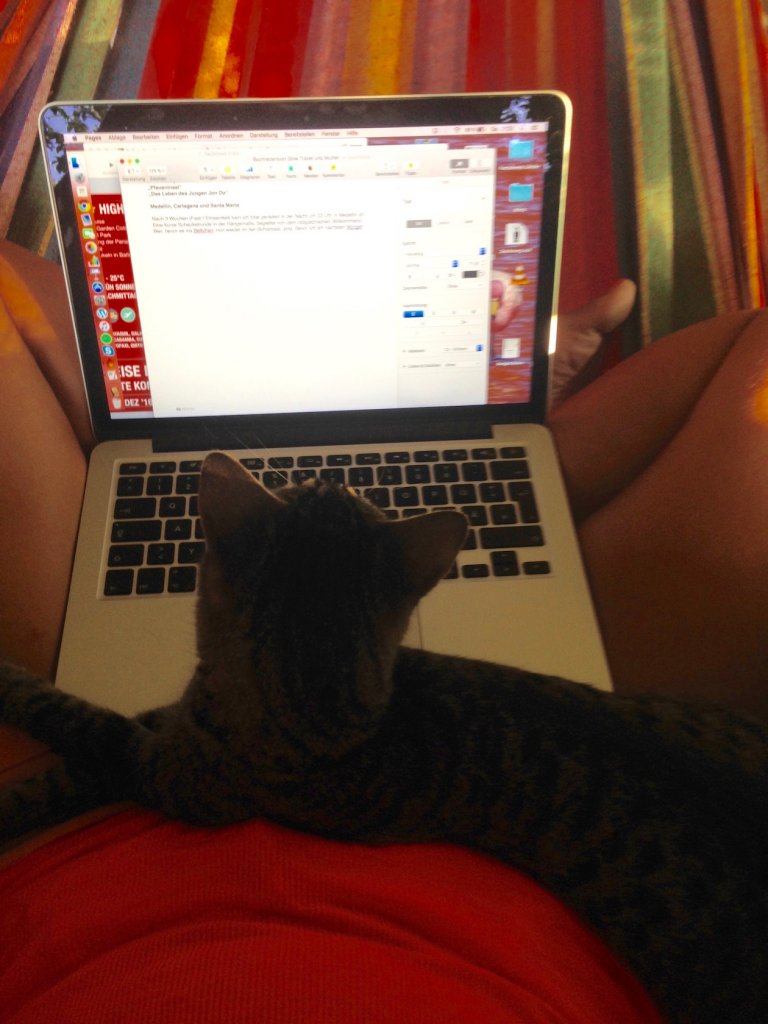 Kaum waren wir in dem kleinen und sehr übersichtlichen Bergdorf Minca angekommen, trennten sich unsere Wege – Pia und Jörn nächtigten stilecht im Boutique Hotel, für mich war nur ein Holzverschlag mit offenem Badezimmer drin ;-). Dafür hatte ich abends beim Blog schreiben kuschelige Gesellschaft. Gut, um ehrlich zu sein, die Unterkunft war gewöhnungsbedürftig und ich war froh, dass die Beiden sich das erspart hatten. Das ist zum Beispiel ein großer Vorteil des Allein-Reisens…wenn man Mist gebucht hat, dann muss man sich keine Gedanken um das Wohlbefinden des Anderen machen. Nach einem kleinen Ortserkundungsspaziergang bin ich bei einem Brownie und wundervollen Kaffee versackt.