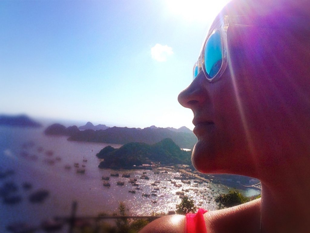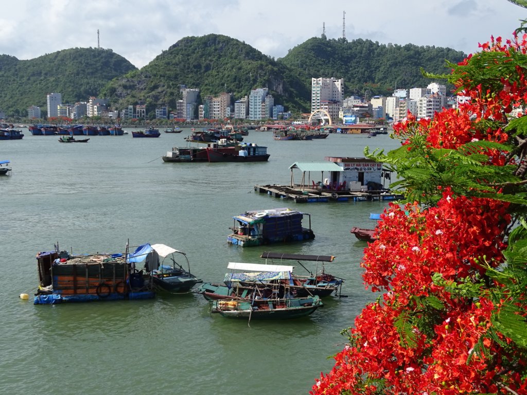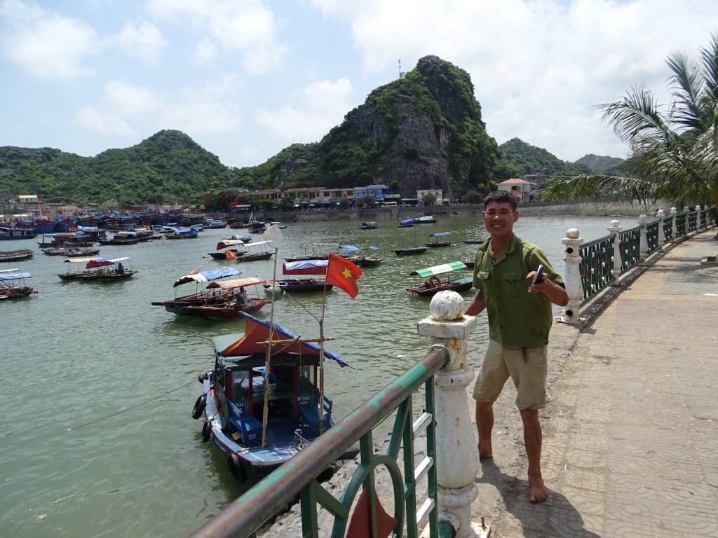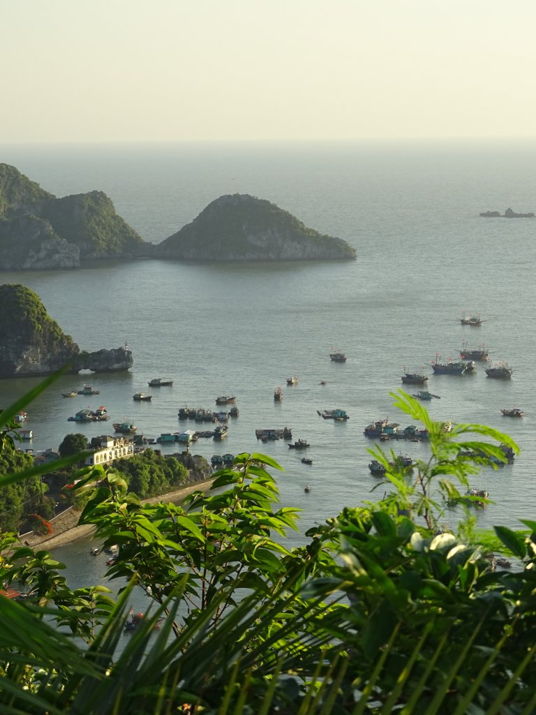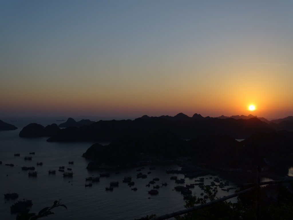 Die Anreise nach Vietnam, bzw. nach Cat Ba Island, war deutlich anstrengender als gedacht. Ich hatte mich entschieden direkt von Hanoi weiter in den Nordosten zu fahren, Richtung Ha Long Bay. Ha Long ist berühmt aus „Fluch der Karibik“, eine Ansammlung von tausend kleinen und größeren Inseln mitten im Meer – da es aber inzwischen touristisch komplett überlaufen ist, wird die kleine Nachbarinsel Cat Ba als Alternative angepriesen. Ist mittlerweile touristisch auch sehr gut besucht. Der Plan war also: Flughafen Hanoi, Taxi zum Busstand, 2x Bus zur Fähre (1x Buswechsel), Speedboat (hüstel, hüstel) zur Insel, Bus zum Stadtzentrum. Insgesamt eine Tour von 6h. Als ich dann endlich in Cat Ba angekommen war, war ich mega unentspannt. Zum ersten hatte ich noch keine lokale SIM Karte und zum zweiten hatte ich ein Bett in einem 30er Zimmer in einem Hostel gebucht und war entsprechend skeptisch. Es war einfach das günstige mit sehr, sehr guten Bewertungen. Und ich habe vorsichtshalber erstmal nur eine Nacht gebucht – für den Fall der Fälle. Wie eine Abhängige hing ich im Bus am Fenster und habe mir nach Schildern den Kopf verrenkt, die Telefonläden anzeigten. Und Gott seit Dank, hielt der Bus direkt vor so einem Laden. Punkt 1 von der Unentspanntheitsliste konnte damit schon mal gestrichen werden. Ich weiß, daß mir das sehr zu denken geben sollte :-(. Danach konnte ich schon deutlich entspannter die Promenade entlangschleichen, ich hatte immer noch meine beiden Rucksäcke dabei, Richtung Bett für die Nacht. Und auch hier erlebte ich eine super angenehme Überraschung. Denn zum einem bekam ich ein Bett in einem 4er Zimmer und zum anderen war es super sauber und gepflegt und die Lage – also wirklich, die Lage war EXZELLENT! Etwas erhöht gelegen konnte ich direkt nach Ankunft einen wunderschönen Sonnenuntergang über der Bucht erleben. Phänomenal! Bei all der Begeisterung ist mir dann aber doch noch das passiert, wo vor sich jeder Urlauber fürchtet – ich habe es geschafft, nach knapp 2 Monaten meine Kreditkarte, inkl. des bereits gezogenen Bargeldes für die ersten Tage/ Wochen in Vietnam zu verlieren!