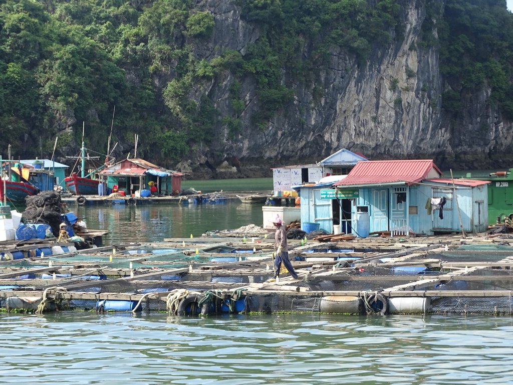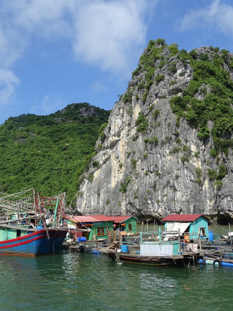 Das wollte ich definitiv machen, wenn ich eines Tages nach Vietnam reisen würde – und jetzt war es soweit. Wir enterten ein mittelgroßes Motorboot und starteten bei bedecktem Wetter. Wir, das waren 2x Besatzung und 4 Franzosen, natürlich 2 Pärchen – ich richtete mich also auf zwei Tage in absoluter Einsamkeit ein. Denn wie bekannt, hat der Franzose es ja nicht so mit dem Englischen und ich es nicht mit der frz. Sprache. Und wieder einmal sollte ich eines Besseren belehrt werden. Die Franzmänner und -frauen knabberten mir förmlich ein Ohr ab und neben ein paar nützlichen Reisetipps für meine Weiterreise lernte ich noch ein paar neue UNO-Spielregeln kennen. Die Bootfahrt war, mit einem ganz einfachen aber absolut passenden Wort ausgedrückt, wunderschön! Wir schipperten zwei Tage durch die vielen tausenden begrünten Felsen und Inseln und machten immer wieder Stopps, um zu schnorcheln, zu schwimmen oder Kayak zu fahren. Ansonsten hieß es totale Entspannung auf dem Sonnendeck! In dieser atemberaubenden Kulisse im Wasser zu sein, die Augen zuzukneifen und wieder aufzumachen und tatsächlich immer noch da zu sein, da wird mir wieder bewusst wie gut es mir geht und ich bin dankbar, dass ich das alles so erleben darf und kann. Die Ha Long Bay ist eigentlich ein Naturschutzpark und ich bin davon ausgegangen, dass es hier ausser ein paar Booten nicht viel gibt. Aber da irrte ich mich gewaltig. Immer wieder passierten wir kleine Siedlungen, die hauptsächlich vom Fischfang leben. Es sind richtige kleine Dörfer auf dem Wasser, sogar mit eigener Kneipe und es gibt unheimlich viele Hunde – denen ist egal ob sie auf den Holzstegen balancieren oder lieber durchs Wasser schwimmen. Und ich war überrascht, dass wir große Teile der Tour für uns bzw. nur mit einem oder zwei weiteren Booten hatten. Vor allem unseren Schlafplatz, mitten in der Bucht, hatten wir für uns ganz allein. Ein Buch später und mind. 2 Punkte mehr auf der Teint-Skala legten wir am frühen Abend des zweiten Tages wieder in Cat Ba an. Für ein frz. Pärchen, die bereits seit 9 Monaten unterwegs sind, war es die letzte Station vor Ihrer Heimreise und man spürte den besonderen Moment den die Beiden erlebten und der sich auch ein stückweit auf mich übertrug.