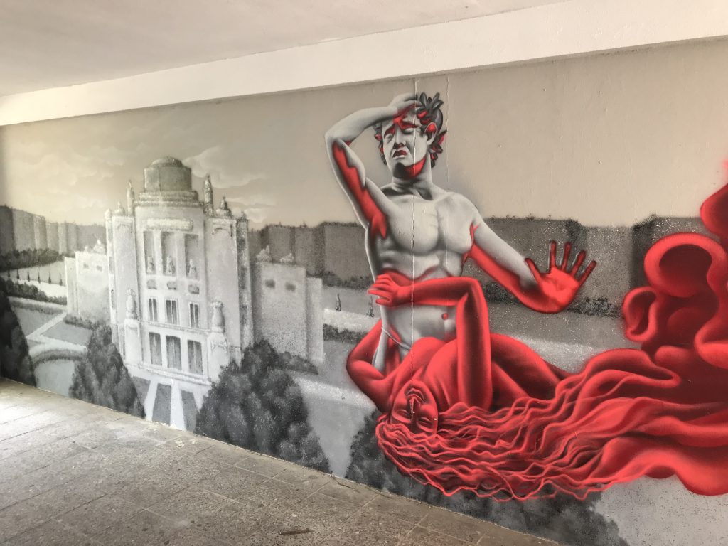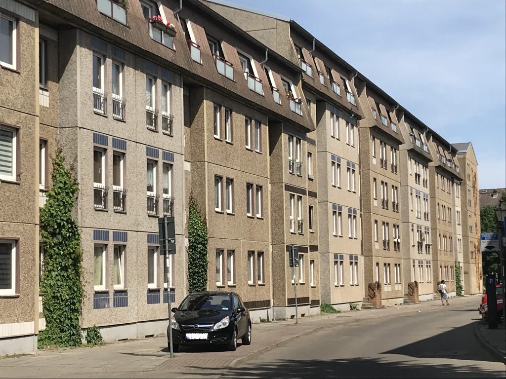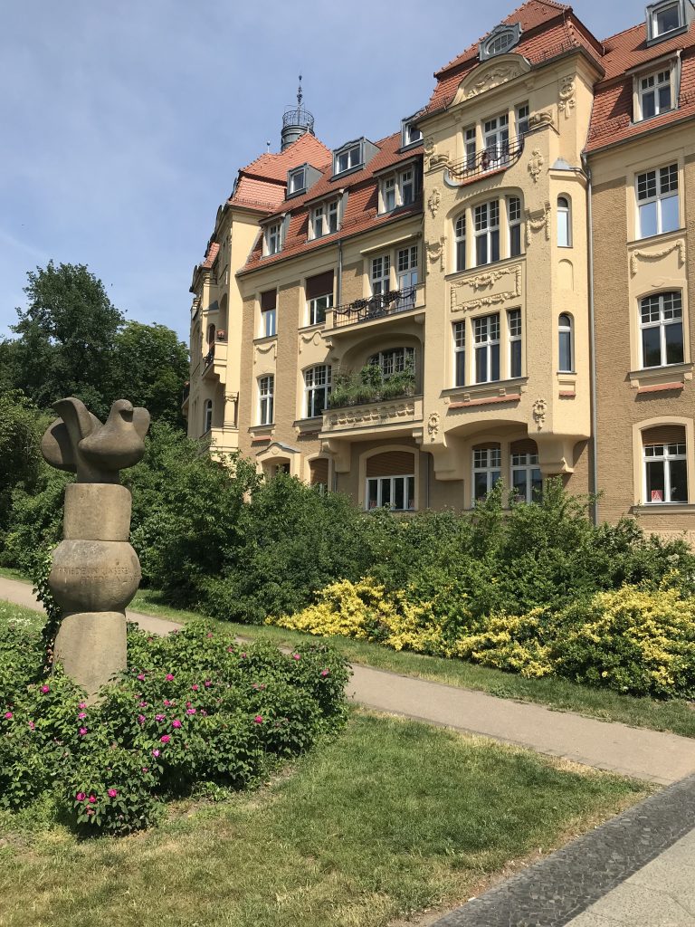 Ein Blick lohnt sich auf die andere Seite der Berliner Straße – der architektonische Stil der Wohnhäuser ist bezeichnend für die Bauweise der DDR. Keine Ahnung wie sich der „Stil“ nennt. Kleine Auflockerung zwischendurch: ein super cooles Grafitto in einer Tordurchfahrt.