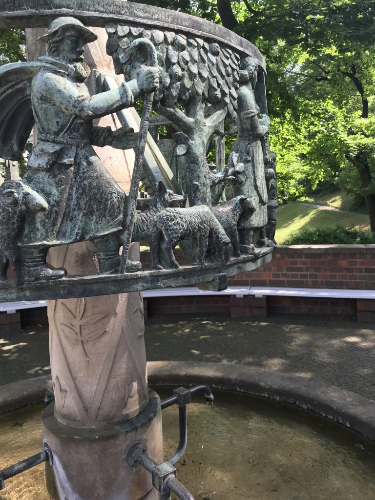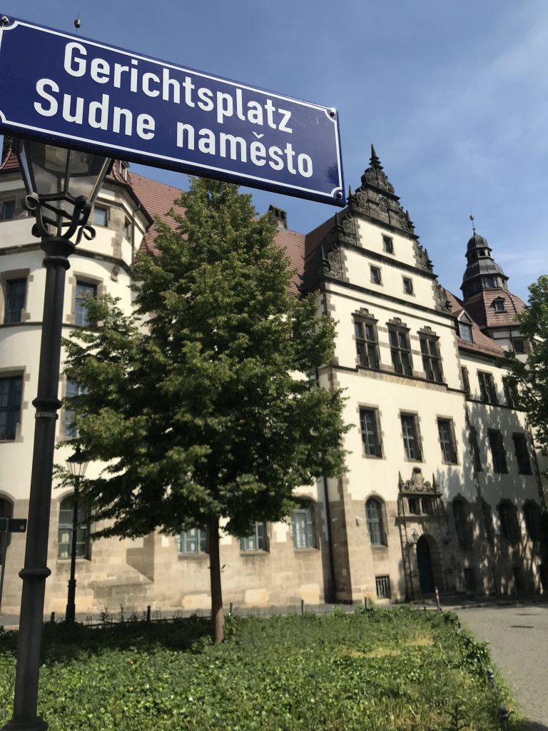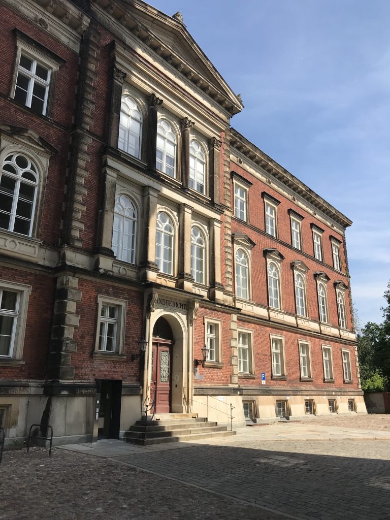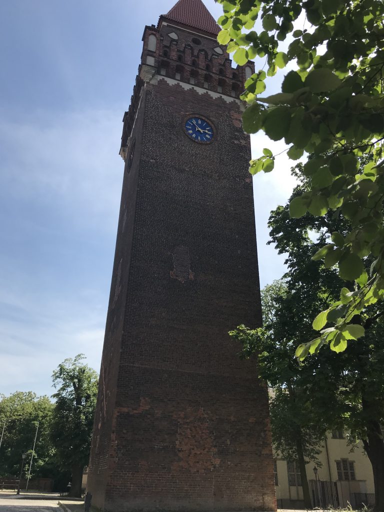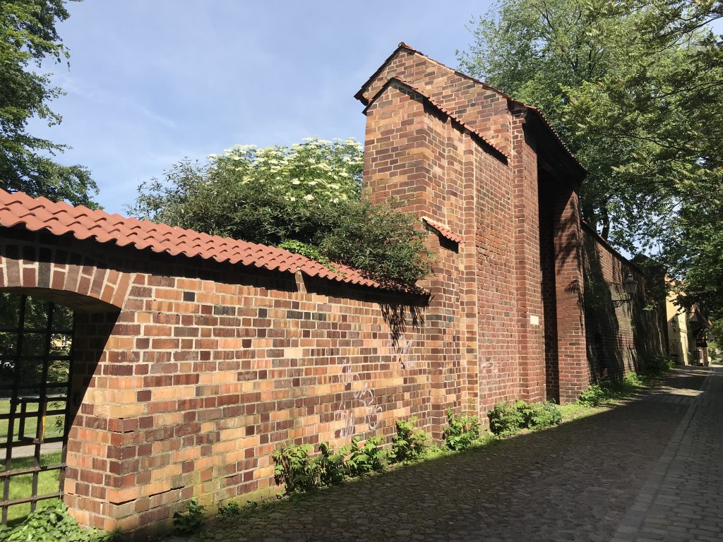 Wie in Dornröschens Märchen liegt der Schloßturm hinter Büschen und dicken Mauern. Nach einem kurzen Weg bergauf finden wir eine Maueröffnung die uns auf den Gerichtsplatz führt. Meine einzige Erinnerung an dieses Viertel ist der Amtsteich, auf dem wir Kinder im Winter immer Schlittschuhlaufen waren. Da er nicht so riesig ist, war die Wahrscheinlichkeit am größten, dass das Wasser zugefroren und halb Cottbus hier auf Kufen anzutreffen war. 🙂