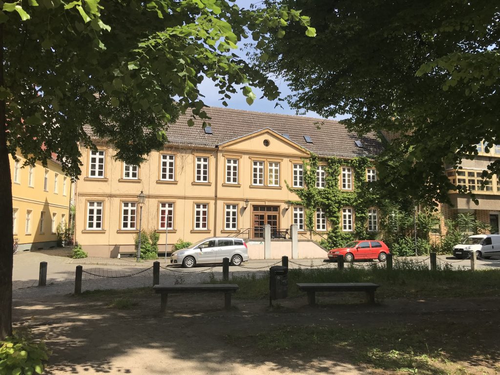 Wir bleiben innerhalb der Spree und überqueren die Sandower Hauptstraße Richtung Schloßturm und Gerichtsplatz.