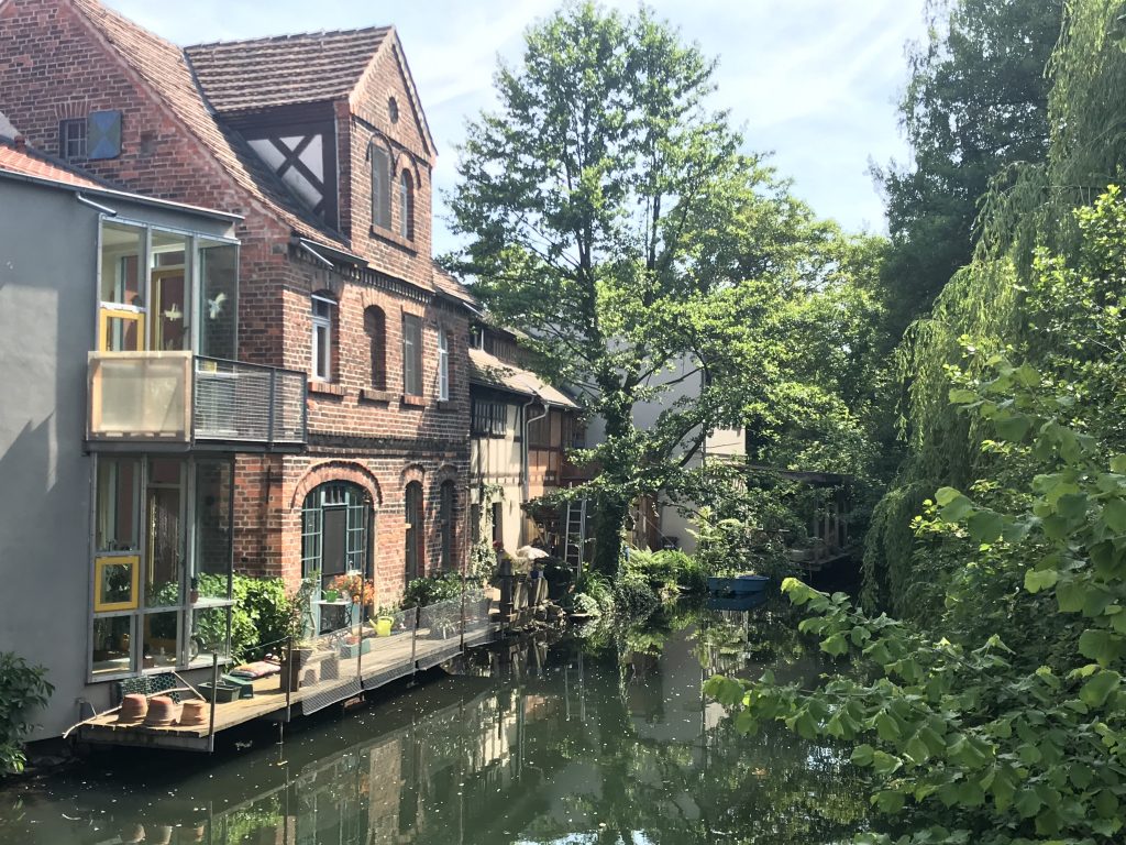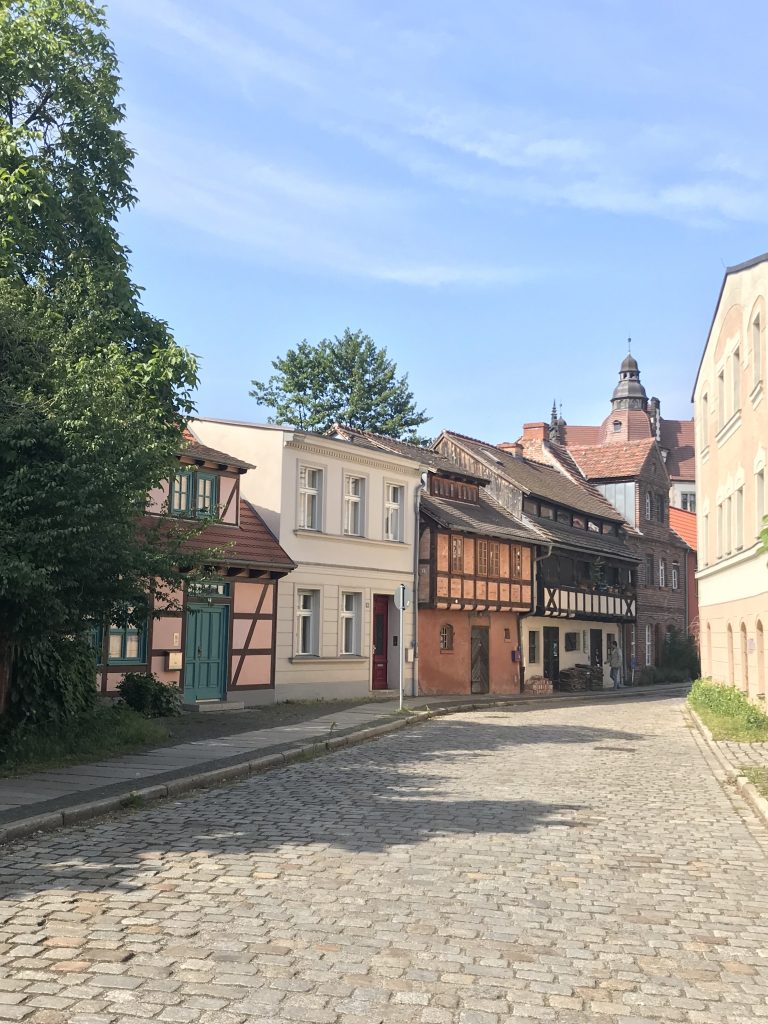 Entlang dem Kopfsteinpflaster und vorbei an den altehrwürdigen Fassaden, können wir vom Gerichtsplatz aus auf ein tolles Ensemble aus Fabrik, Spreewehr und alten Wohnhäusern blicken.