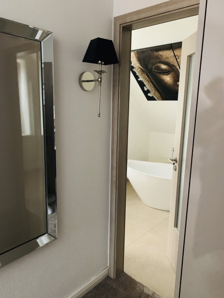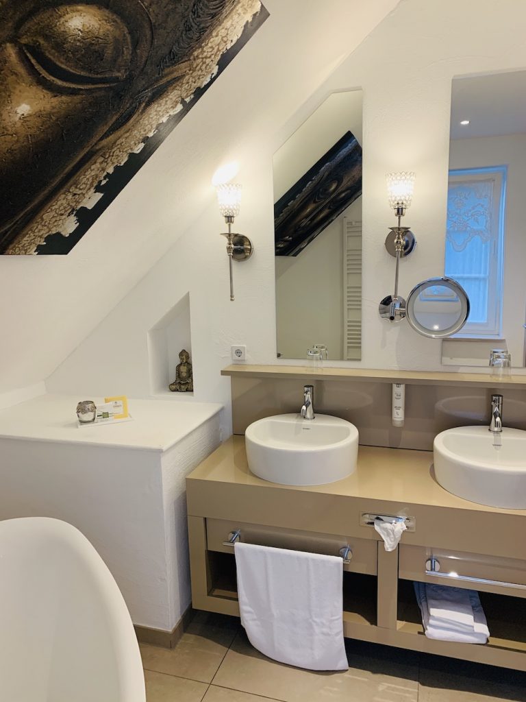 Das Badezimmer trumpft mit einer freistehenden Badewanne, zwei Waschbecken und einer Extra-Toilette auf. Allerdings ist die Badewanne auch gleich ein Minuspunkt für alle Duschfans. In unserem Zimmer gibt es nämlich keine Dusche! Und da Shampoo und Duschbad fest an den Wachsbecken fixiert sind, ist es eigentlich unmöglich die Badewanne als Duschersatz zu nutzen. Schade :-(.