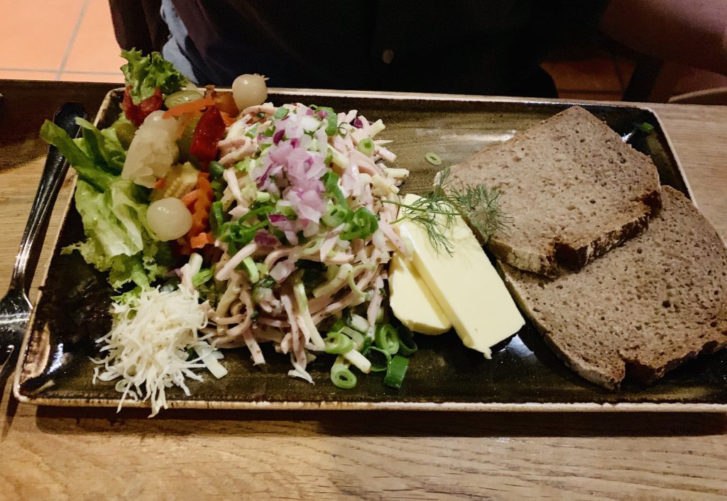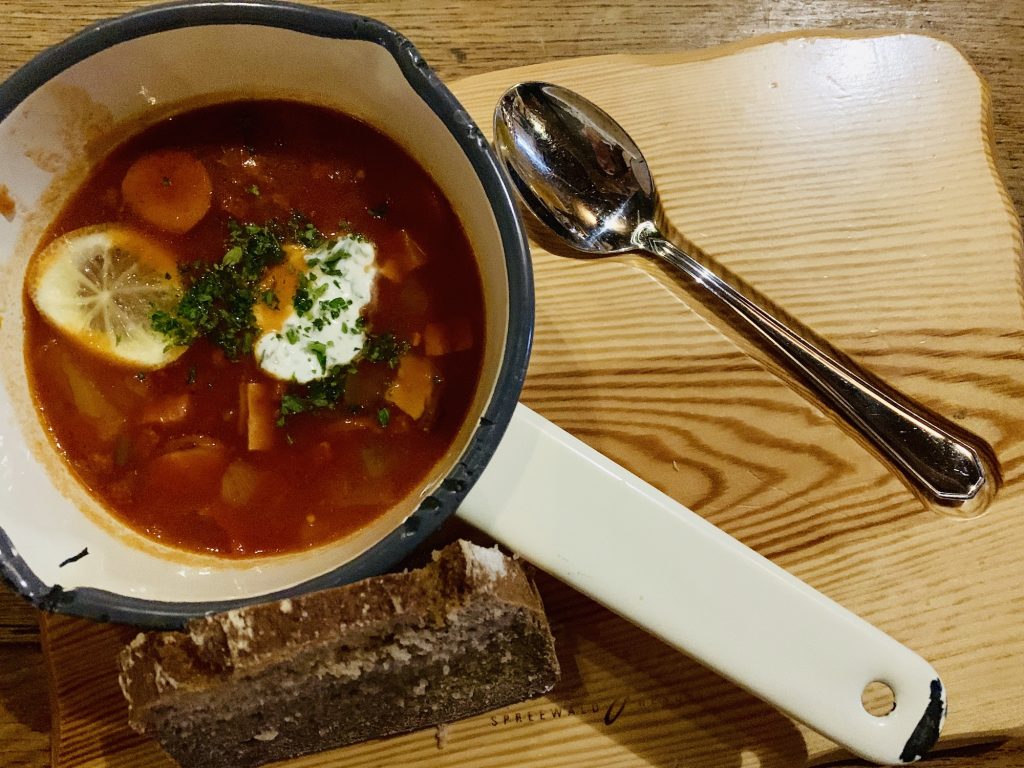 Wir probieren die Soljanka, den Käse-Wurst-Salat, die Pellkartoffeln und ein Cordon Bleu. Begleitet von einem Spreewälder Hefeweizen und als Absacken gibt es einen Spreewälder Kräuterlikör.