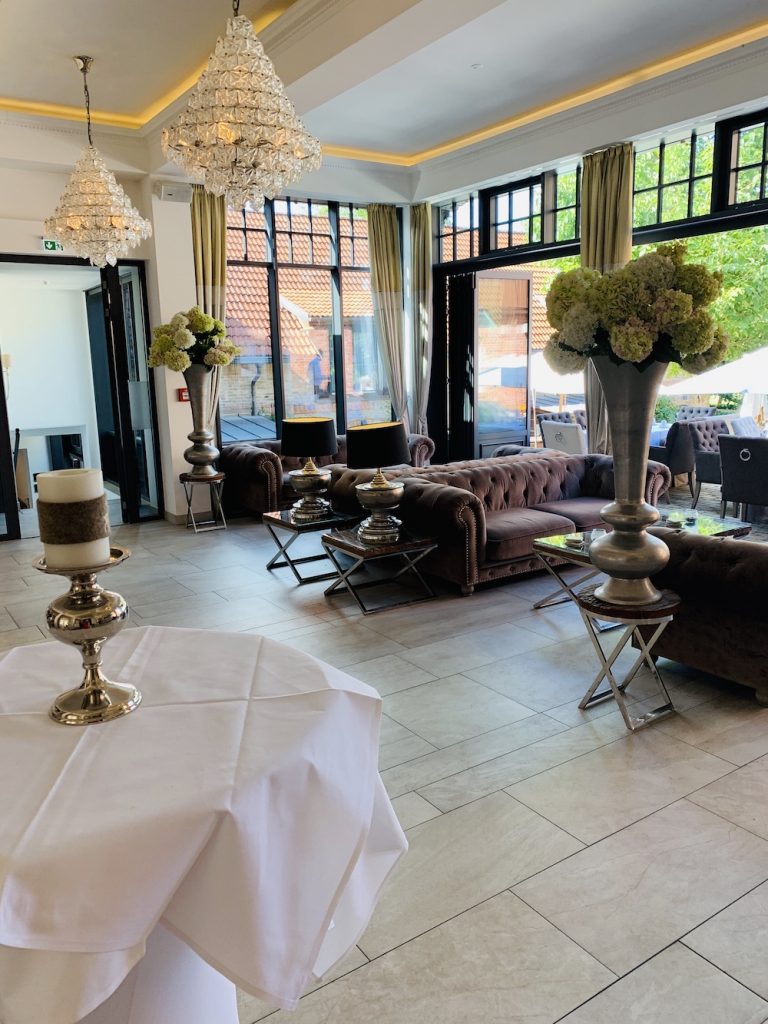 Man betritt einen hellen Rezeptionsbereich mit kuscheligen Sitzgelegenheiten und fühlt sich sofort Willkommen. Durch die Bar kommt man auf die große Terrasse mit einem herrlichen Blick auf den großen Garten und das Fließ.