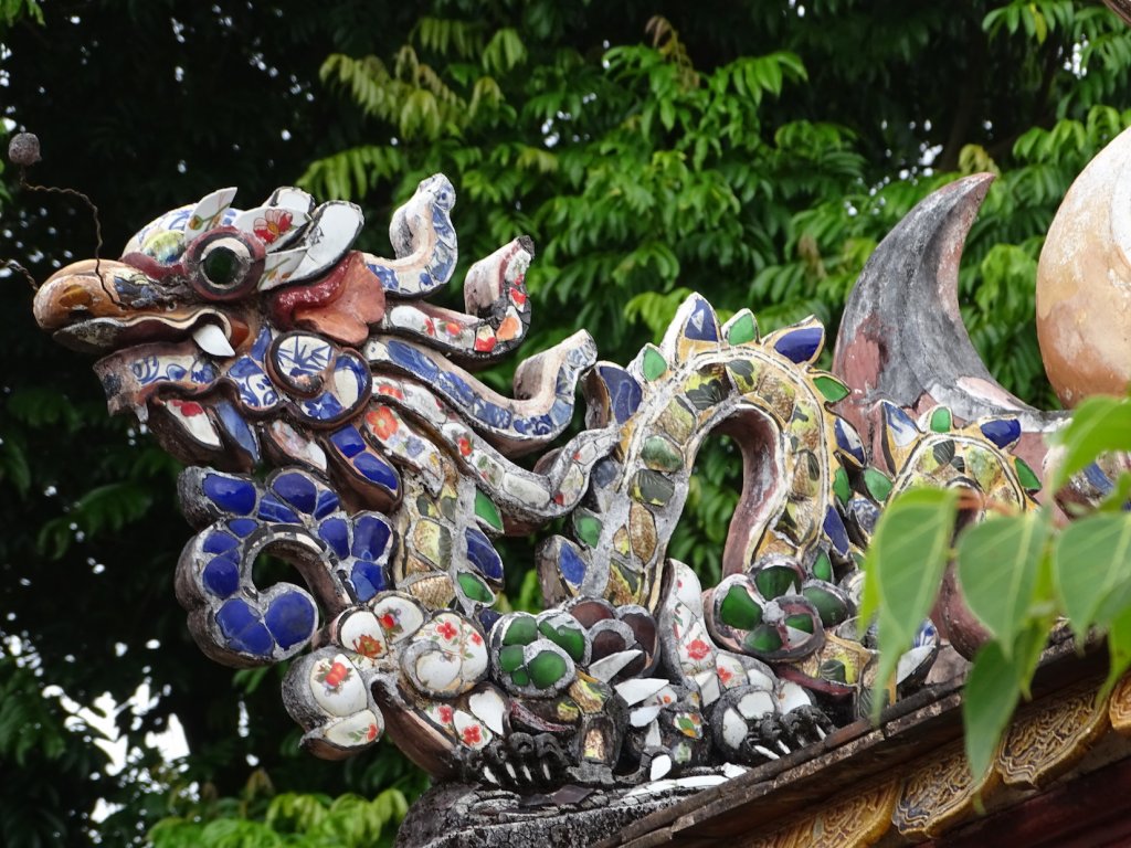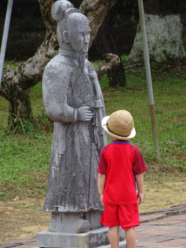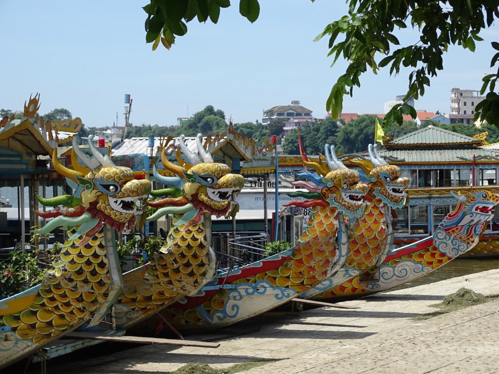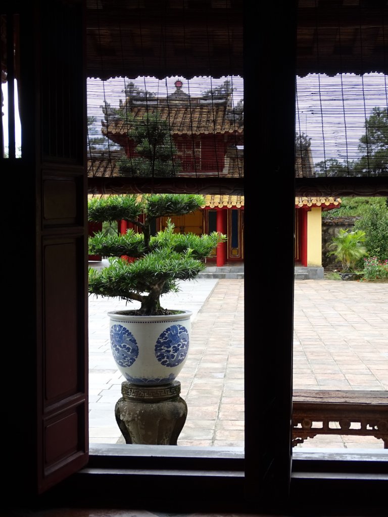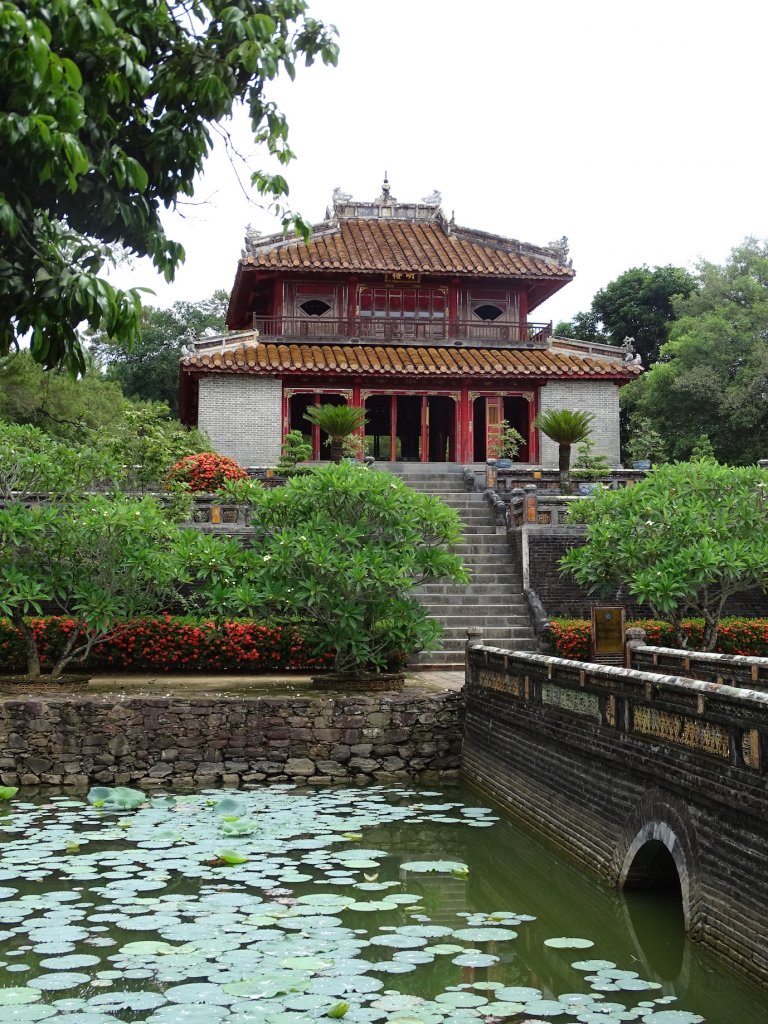 Ehrlich gesagt weiß ich gar nicht genau warum ich nach Hue gefahren bin. Der Lonely Planet hat irgendwas erzählt von monumentalen, historischen Gebäuden und einem imperialistischen Flair. Hmm, früh um 8 sah das grad alles nicht so danach aus. Im Hostel wurde ich in ein 6er Dorm gesteckt, in dem bereits 4 Jungs fröhlich vor sich hin schlummerten. Ich war irgendwie lustlos…wollte nur unter die Dusche und nicht mehr raus in die Hitze. Also ging es nach der Dusche erstmal ins Bett. Die Unterkünfte in Vietnam sind wirklich gut. Obwohl recht klein, sind sie erstens immer sauber und bieten zweitens genügend Privatsphäre, da man die Betten durch Vorhänge vor Einblicken schützen kann. Als die Jungs dann aufgewacht sind, konnten sie zwar nicht mich sehen, aber meinen Rucksack und meine Klamotten, und ganz leise haben sie sich gefragt ob denn nun ein „girl“ eingezogen wäre. Yep, ist es…aber jetzt wollte ich erstmal meine Ruhe haben und habe mich nicht gerührt. Irgendwann meldete sich dann mein schlechtes Gewissen uns so schön war es in dem Zimmer dann auch wieder nicht, dass ich dort den ganzen Tag hätte verbringen wollen. Also raus in die Hitze und die monumentalen historischen Sehenswürdigkeiten gesucht. Am Perfume River schlenderte oder besser schlich ich meines Weges, ich war immer noch total matschig im Hirn und sehnte mich nach einem Kaffee. Und auf der anderen Seite des Flusses fand ich ein ganz kleines Cafe, in dem sich nur Einheimische erfrischten…und ich genoß meinen Kaffee und beschloß da erstmal zu bleiben und holte mein Buch heraus. Als ich nach einer Weile aufschaute hatte sich der Himmel bedrohlich verdunkelt. Eine dicke, fette Gewitterwolkenfront zog auf und ich war mir sicher, dass ich es auf gar keinen Fall rechtzeitig zurück ins Hostel schaffen würde. Und so blieb ich sitzen, während um mich herum die Tische und Stühle vor dem drohenden Unwetter in Sicherheit gebracht wurden. Nicht nur ich harrte der Dinge, auch eine Mutter mit ihrer Tochter wollten dem Unwetter trotzen, oder einfach nur noch ein bißchen in meiner Nähe sein. Schon die ganze Zeit hatten sie „heimlich“ Fotos von mir gemacht und plötzlich saß die Mama direkt neben mir und die Kleine musste Selfies von