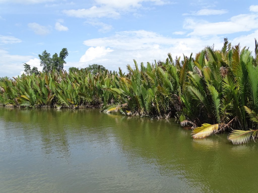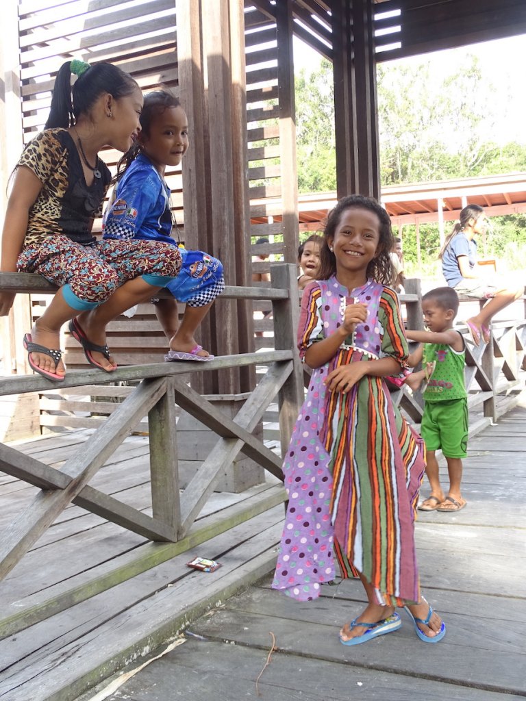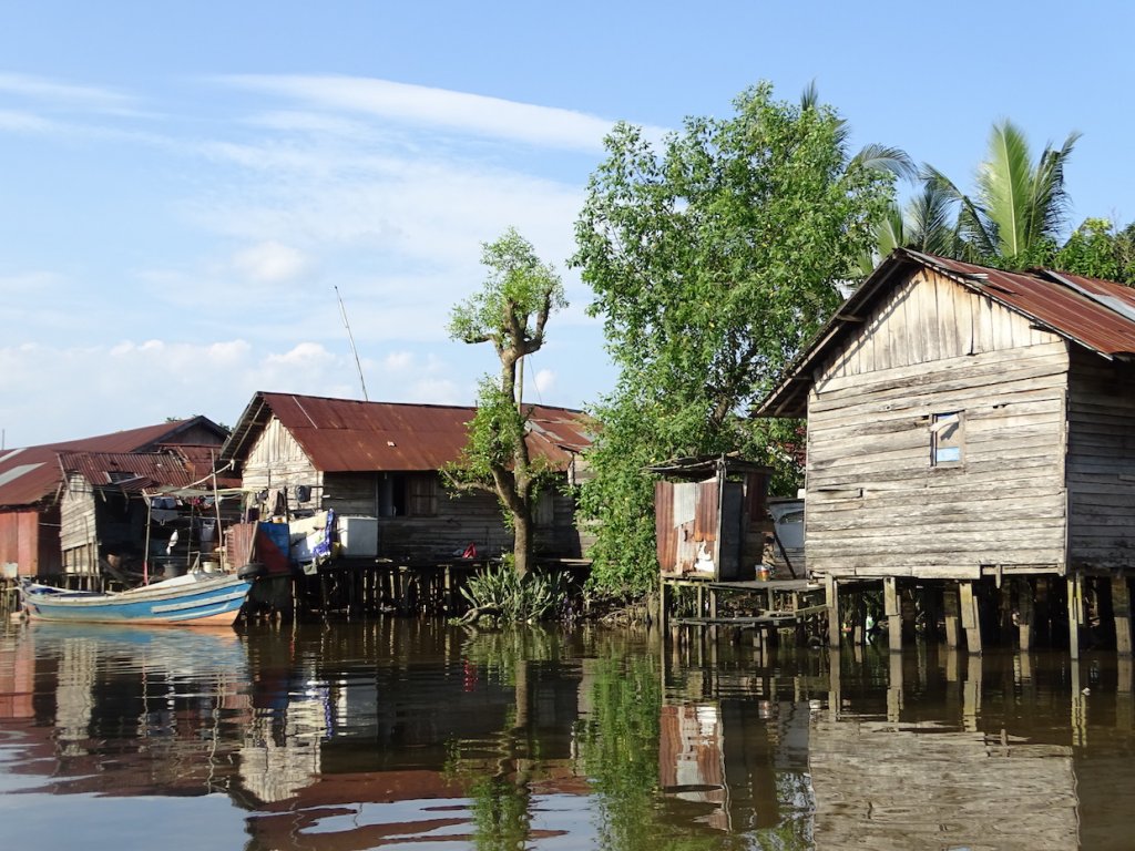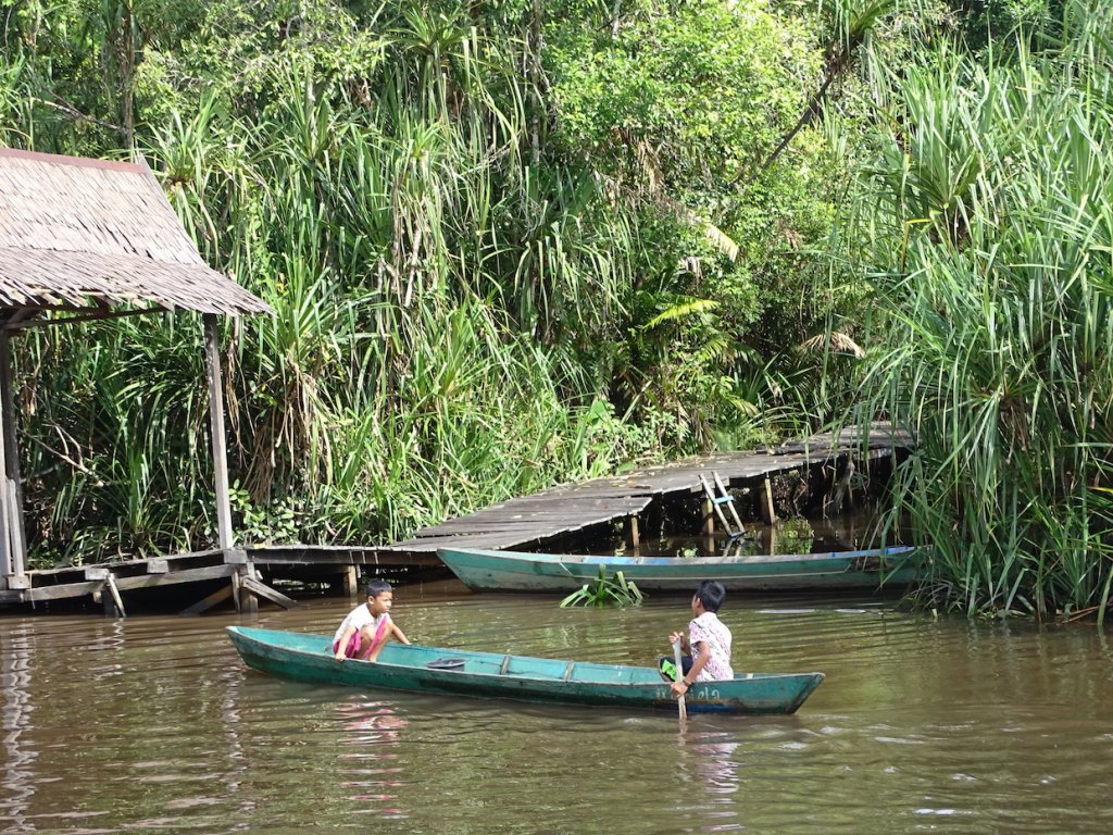 Am Nachmittag machten wir einen kurzen Spaziergang in dem schräg von der Aufzuchtstation gegenüberliegenden Dorf Sekonyer. Zurück auf unserem Hausboot ging es weiter flußabwärts, immer den Kopf in die Höhe gestreckt, denn in den Baumwipfeln tummelten sich Makaken und Nasenaffen.