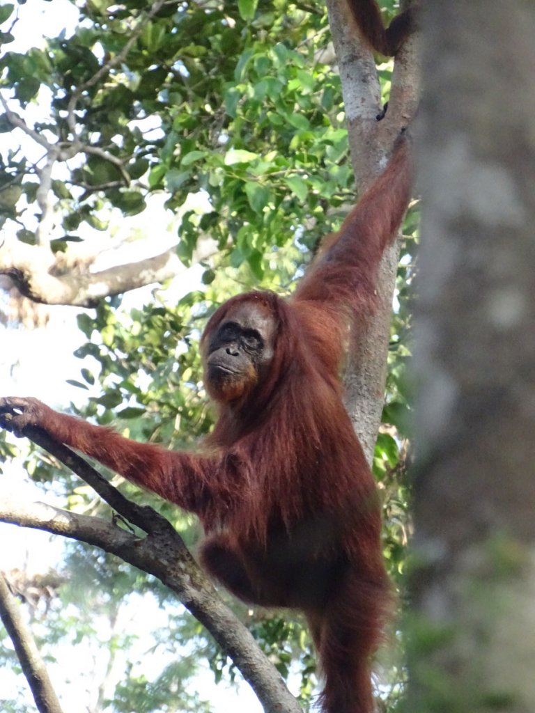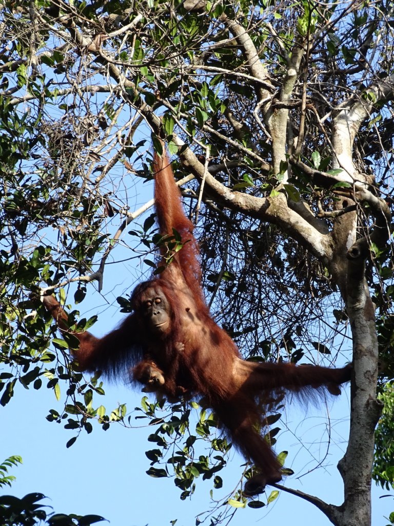 Unglaublich viele Muttertiere mit ihren Kleine und Größeren sind dabei und wir lernen, dass ein Orang Utan Baby bis zu 8 Jahren bei der Mutter verweilt. Während die Einen fressen, turnen die Anderen in den Wipfeln über uns herum und verschwinden dann langsam wieder in den dichten Dschungel.