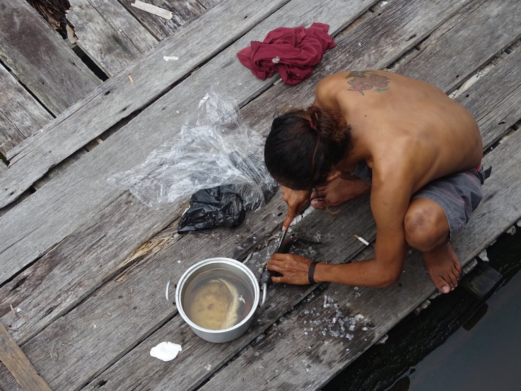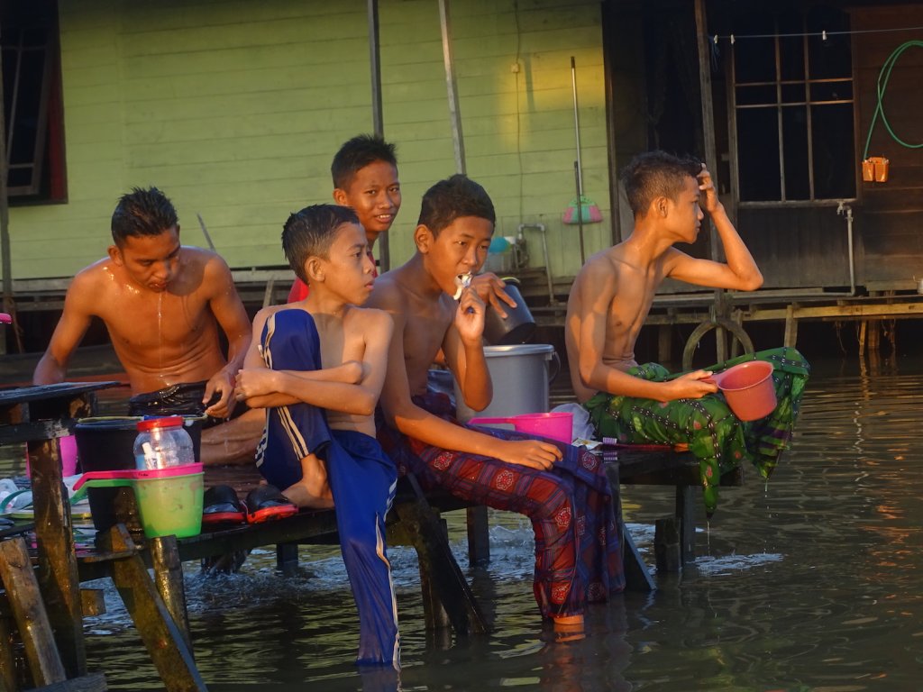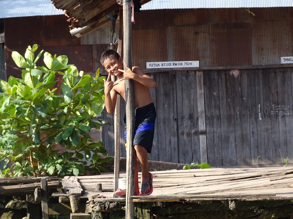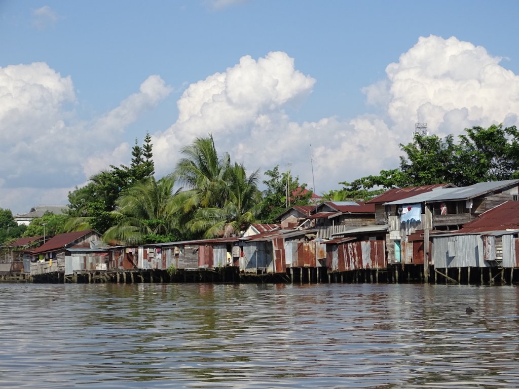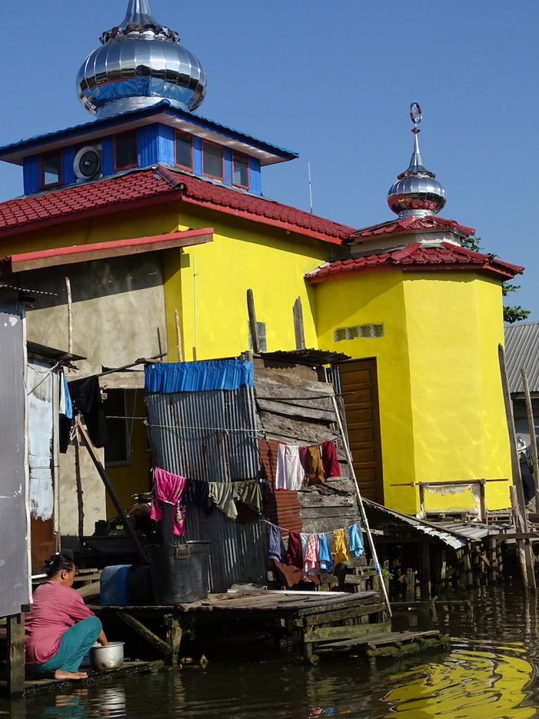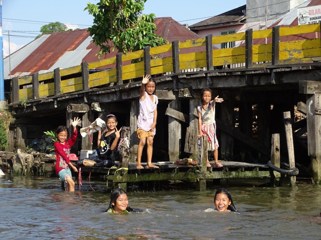 Mit einem Miniboot durchquerte ich die zahlreiche Kanäle und Flussarme, welche sich durch Banjarmasin ziehen. Das Leben findet hier hauptsächlich am Fluß statt. Zum Duschen springt man morgens einfach in den Fluß oder kippt sich literweise das Flusswasser, hockend oder auf dem Steg sitzend, über den Kopf. Im selben Fluß wird das Geschirr abgewaschen, die Wäsche gewaschen und leider auch das persönliche Geschäft verrichtet sowie der Müll entsorgt.