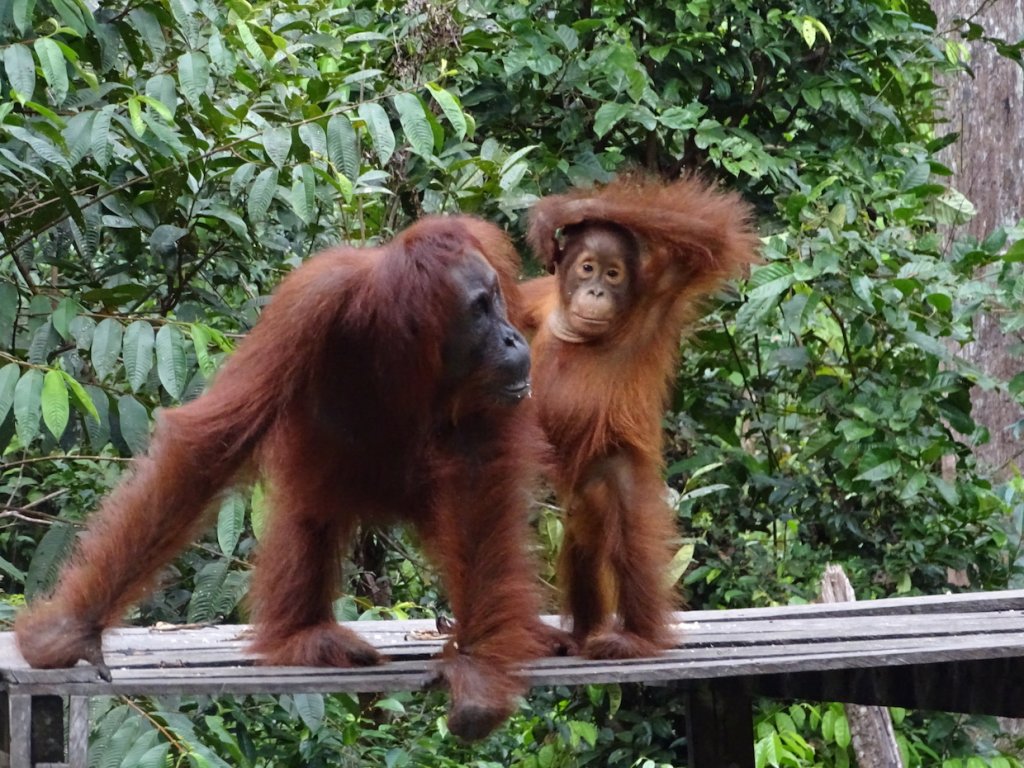 Am Rand des Ufers und auf dem Steg kann es auch schon mal passieren, dass ein Orang Utan des Weges daherkommt – hier sind sie besonders gut an den Menschen gewöhnt.