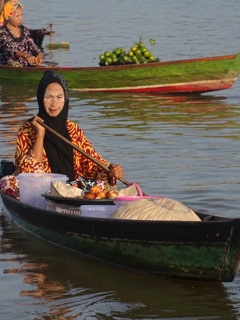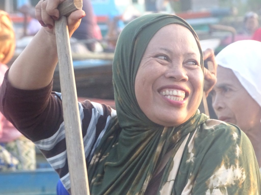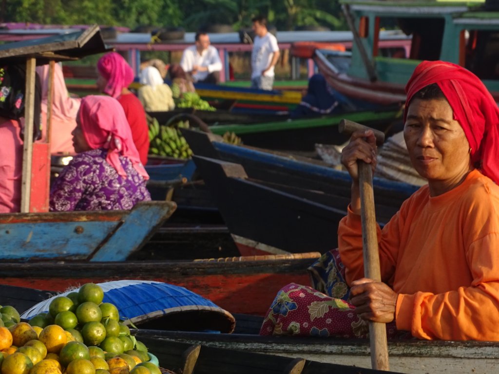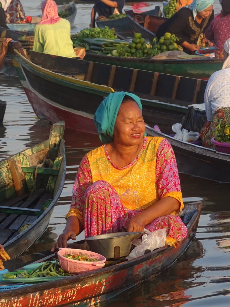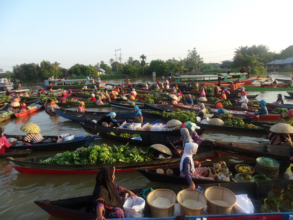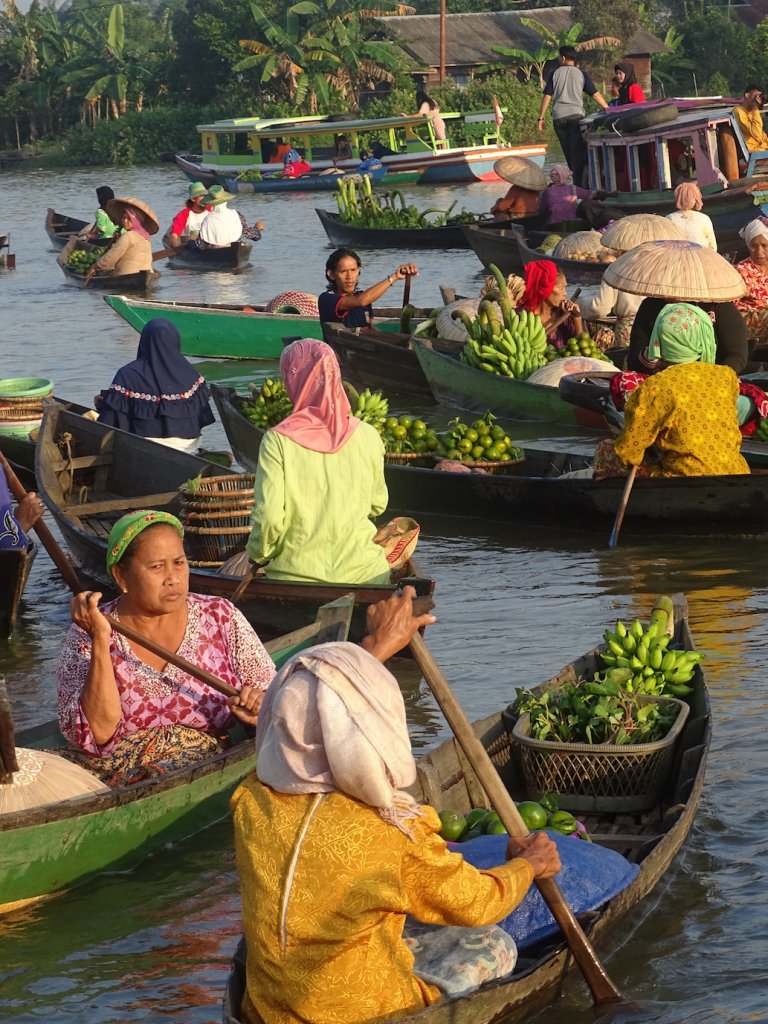 Highlight hier in Banjarmasin, abgesehen von den Menschen, sind die schwimmenden Märkte, berühmt in ganz Indonesien. Also ging es heute, noch vor Sonnenaufgang, wieder ins Boot und nach ca. 45 Minuten war ich mittendrin – im schwimmenden Markt von Lokbaintan.