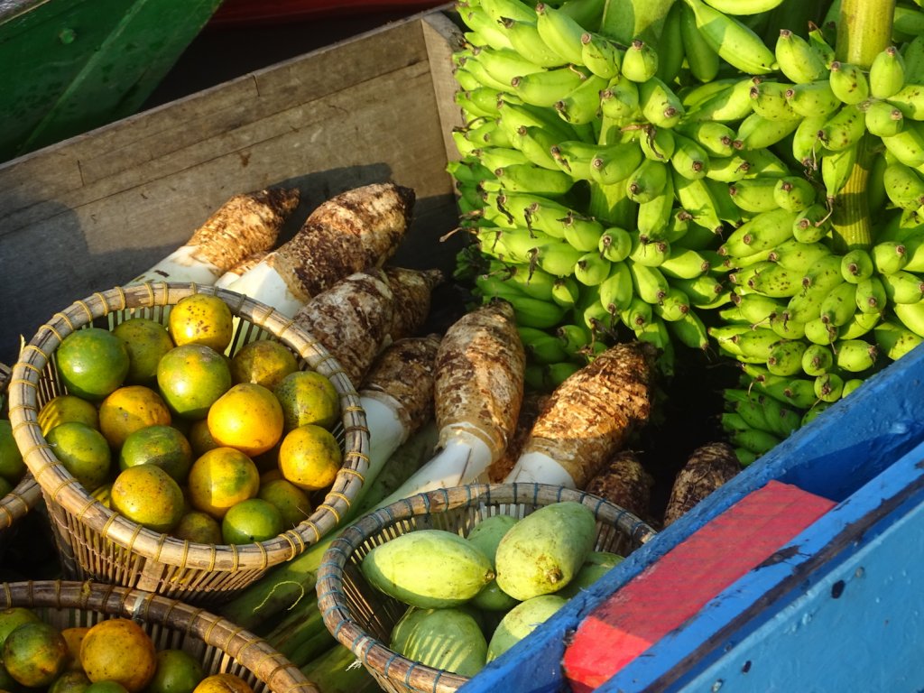 Was für ein Gewusel, was für Farben, was für eine Geräuschkulisse. Anstatt in den Supermarkt zu fahren, steigt man hier ins kleine Holzboot, packt Bananenstauden, eimerweise Limetten, Obst und Gemüse, Kleidung etc. ein und geht „shoppen“. Neben dem Geschäftlichen wird die Zeit natürlich auch zum Austauschen der letzten Neuigkeiten genutzt. Ein kunterbuntes Treiben und herrlich anzusehen.