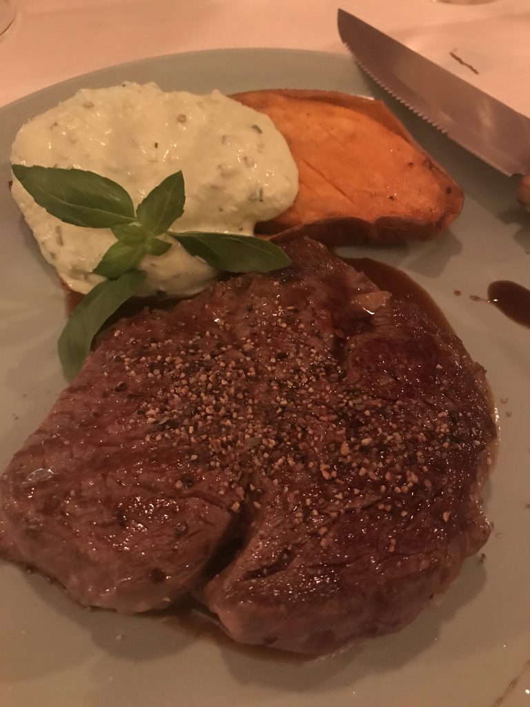 Das Fleisch war ein Traum – es war genau so auf den Punkt gebraten wie ich es möchte. Und die Jus – mein Gott war die lecker. Dazu gab es eine halbe Süßkartoffel und eine Bärlauchcreme. Alles passte perfekt zueinander.