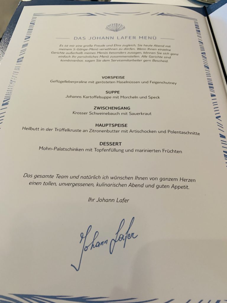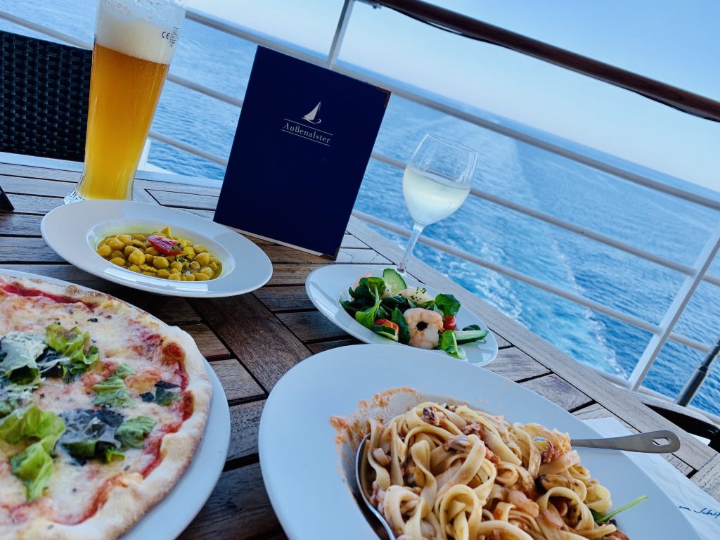 Begeistert war ich vom Atlantik – das klassische Speisenrestaurant, welches es auf jedem Mein Schiff gibt. Täglich stehen 4 Menüs zu Auswahl, unter denen fleißig hin und her getauscht werden kann. Neben klassischem und vegetarisch/ veganen Menü gab es noch ein von Johann Lafer inspiriertes Menü. Die Speisen waren eigentlich immer auf Klasse-Niveau.