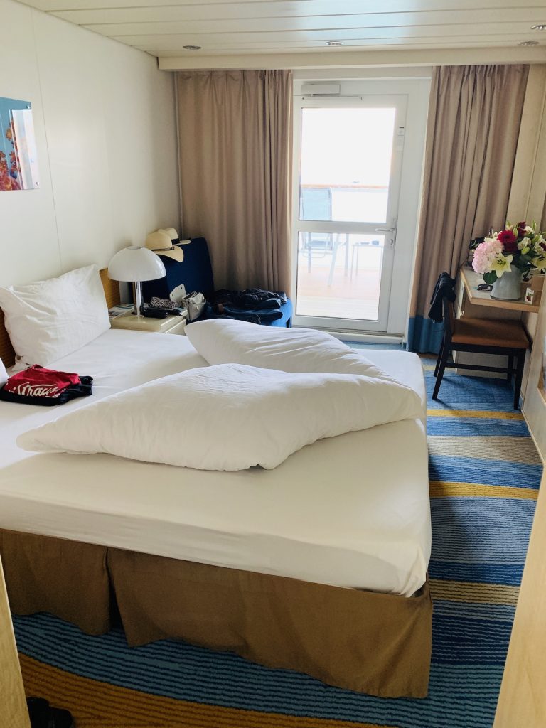 Da Kabineninnere überraschte uns mit Ausstattung und Geräumigkeit. Hell und funktional, sogar mit einem kleinen Sofa und Schreibtisch. Ausreichend Schränke, vor allem zum Verstauen der Koffer, waren vorhanden – so dass wirklich nichts rumlag.