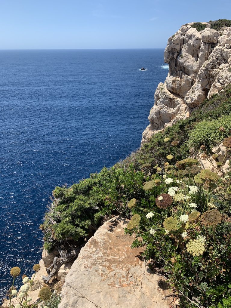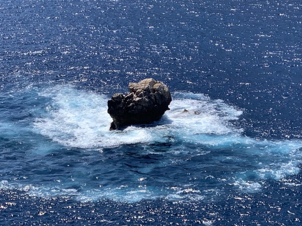 Auf dem Weg nach Alghero machen wir, und 3-4 andere Reisebusse, halt an den eben schon erwähnten Klippen am Porte Conte. Ein wundervoller Ausblick tut sich vor uns – das Meer knallt mit voller Wucht an die Felsen und die weiße Brandung bildet einen herrlichen Kontrast zum tiefblauen Meer.