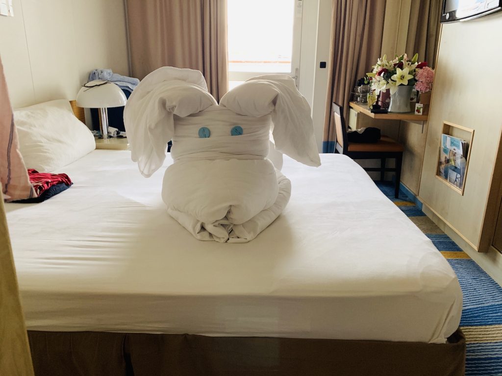 Die Kabinen werden 2x tgl. vom Service betreten – wie oft Bettwäsche und Handtücher gewechselt werden entscheidet jedoch der Gast. Besonders witzig, die Kunst des Bettdeckenfaltens, die man als Crewmitglied wohl beherrschen muss. Ob nun Segel, Krabbe oder Raute – es war immer spannend was uns da so erwartete.