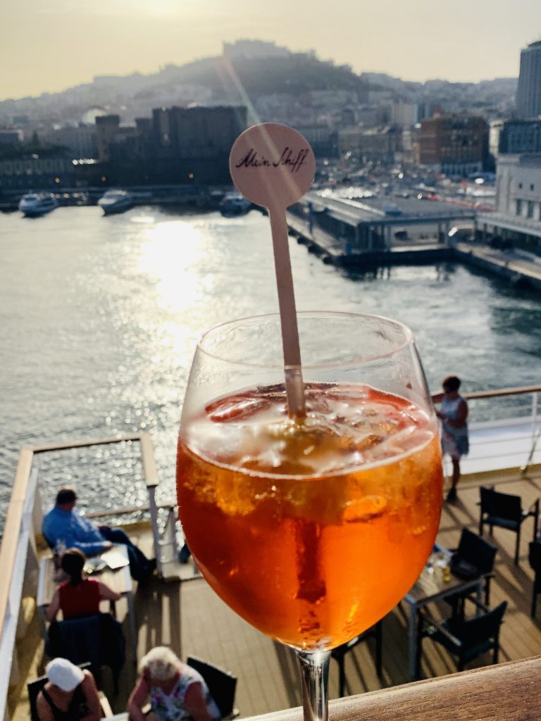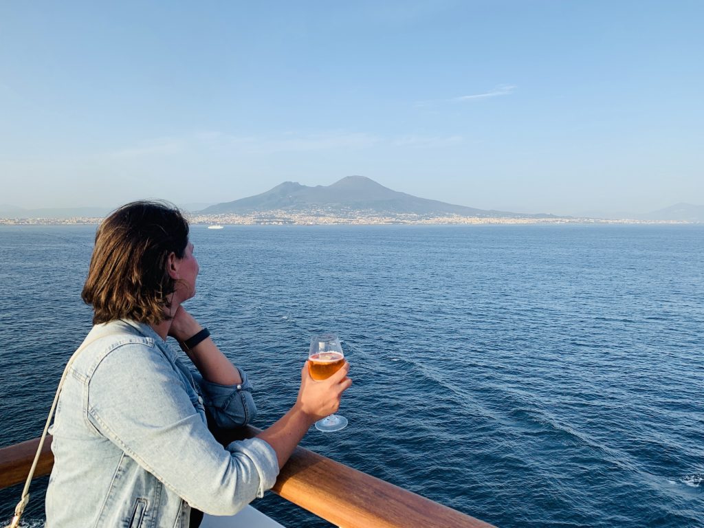 Fix und fertig, aber überglücklich, und voll mit neuen Eindrücken stehen wir bei Sonnenuntergang an der Reeling und genießen den Blick auf das abendliche Neapel und den Vesuv, während die Mein Schiff Kurs setzt zurück nach Malta.