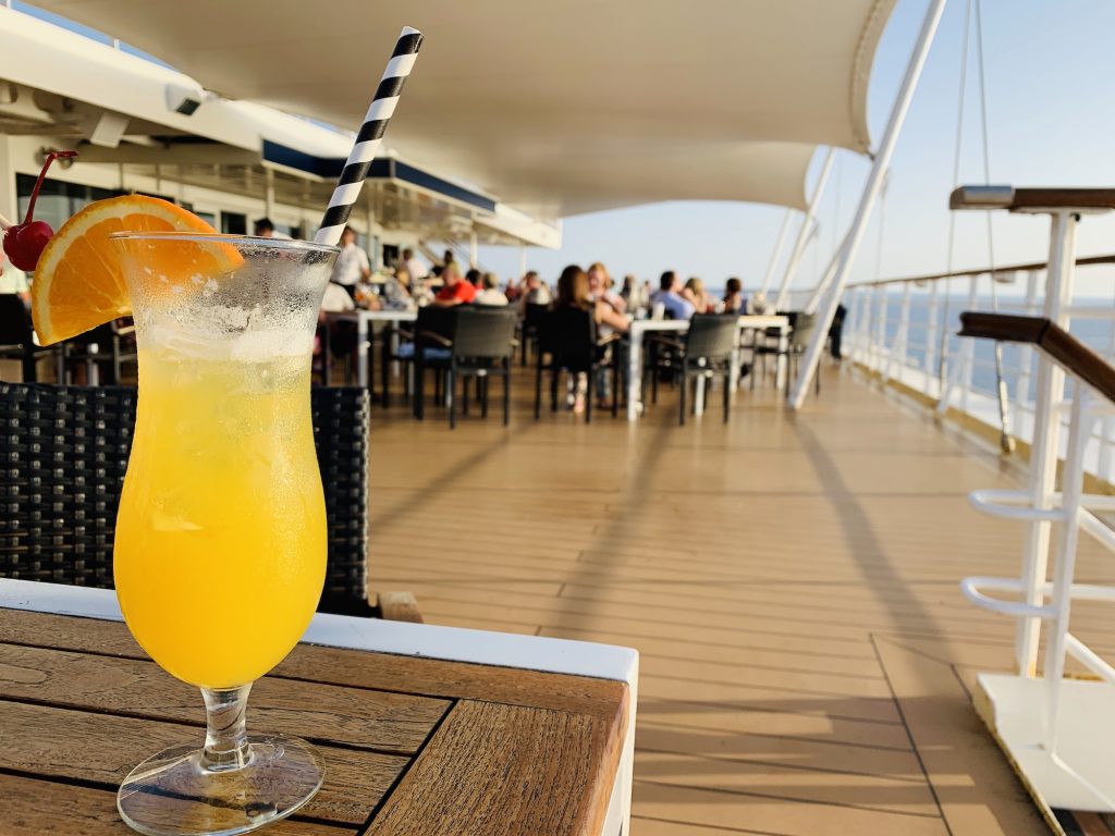 Die Koffer werden beim Check in am Kreuzfahrtterminal abgegeben und bis 18 Uhr zur Kabine gebracht. In der Zeit bis dahin kann man sich schon mal einen Drink holen, eine Kleinigkeit Essen oder an der Tour durchs Schiff teilnehmen. Sehr zu empfehlen, vor allem für Kreuzfahrtneulinge und um eine Orientierung und den einen oder anderen Tipp zu bekommen.