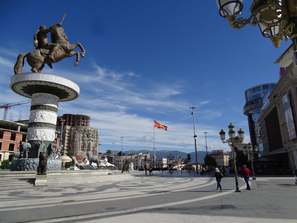 Als wir gegen 13 Uhr in Skopje landen, empfängt uns strahlender Sonnenschein und 30°Grad im Schatten. Unser Hotel liegt sehr zentral, direkt am aktuell nach Googlemaps benannten Alexander of Macedon the greatest of Greek – Platz …und damit befinden uns direkt im aktuellen politischen Geschehen. Dazu aber später mehr.