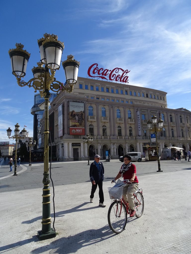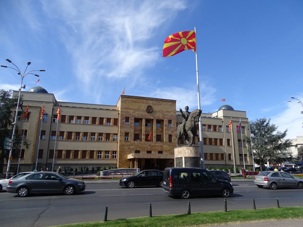 Weiter gehts vorbei am Parlament und einer der wenigen Grünflächen in Skopje. Gegenüber vom Parlament befindet sich ein beliebter Park, um gegen die Regierung und für die guten alten Zeiten des Kommunismus zu demonstrieren. 😉