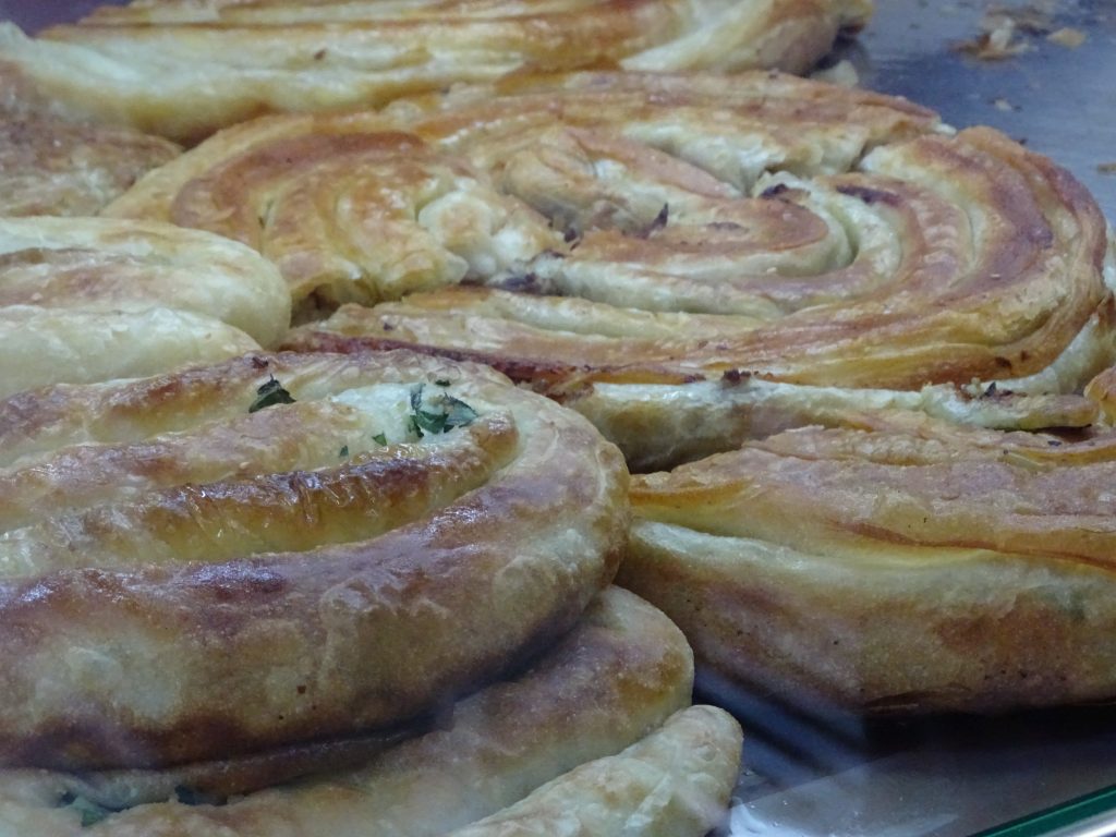 Hinter dem Parlament befindet sich eine kleine unscheinbare Börekstube. Tag und Nacht wird hier das fettige Blätterteiggebäck frisch zubereitet. Gefüllt mit Spinat oder Käse ist es das Nationalgericht der Mazedonier. Ob zum Frühstück, Mittag, Abend oder als Mitternachtssnack – mit einem Ayran, der das ganze Fett neutralisiert, ist es das ideale Katerfrühstück.
