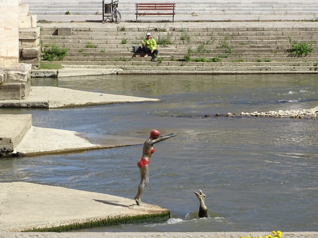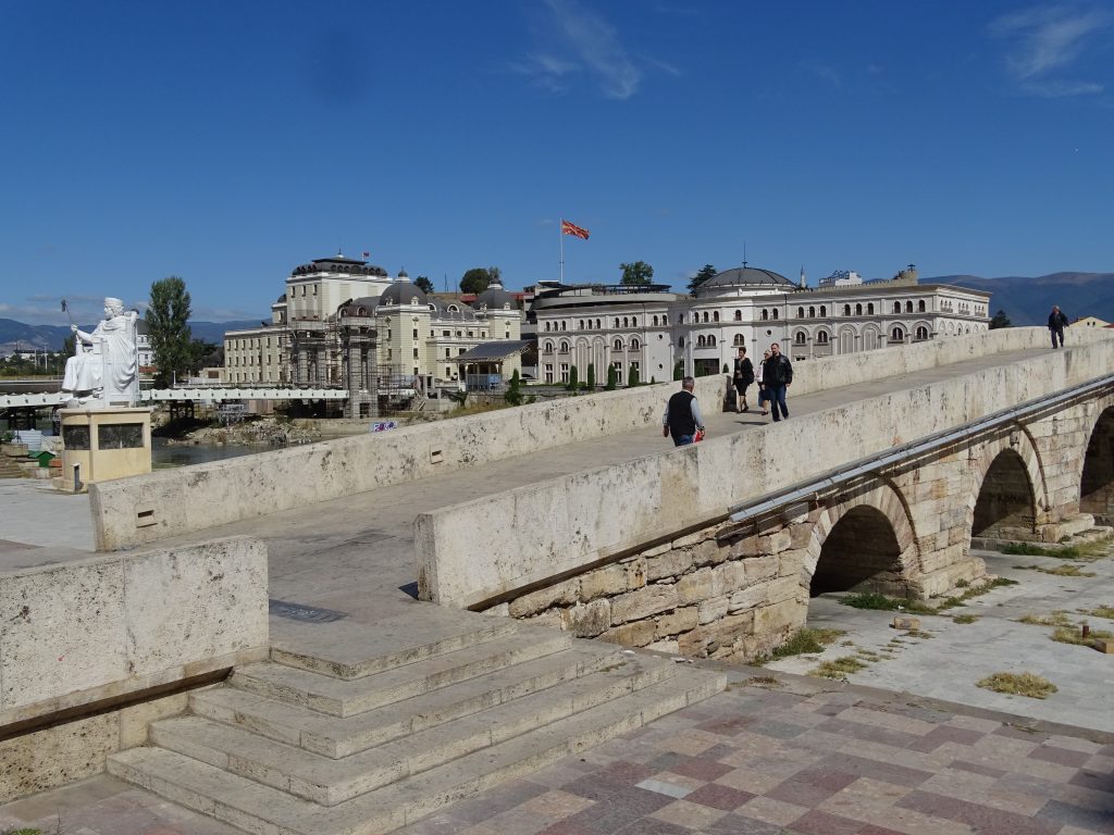 Im Hotel Arka verschaffen wir uns auf der leider schon geschlossenen Rooftopbar dennoch einen guten Überblick über die verwinkelten Gassen und Einkaufsstraßen des größten Basars im Balkan, ausserhalb Istanbuls. Auch hier sind die Straßen geordnet nach den Gütern die man(n) oder Frau erwerben möchte. Hauptsächlich dominieren Schmuck- und Stoffgeschäfte das Straßenbild. Lang halten wir es bei dem Wind nicht draussen aus und überqueren den Vardar, vorbei an den beeindruckenden Gebäuden und Skulpturen mazedonischer Nationalhelden.