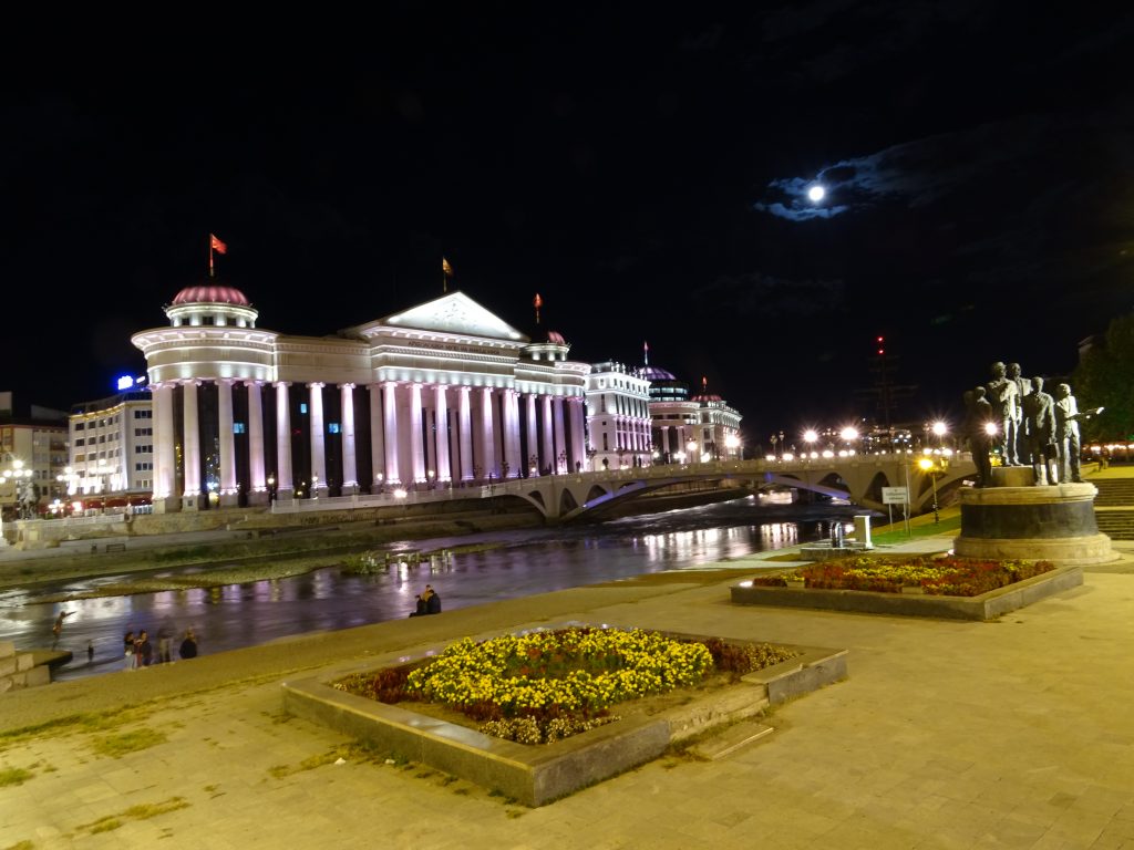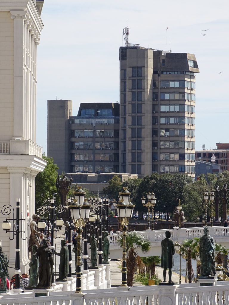 - Uferpromenade, mit den Gebäuden und Statuen aus dem Projekt Skopje 2014. An einigen dieser Gebäude sieht man heute noch Farbkleckse. Diese stammen aus einer friedlichen, bunten Revolution der Mazedonier im Jahr 2016 gegen die korrupte Regierung.