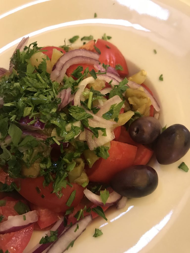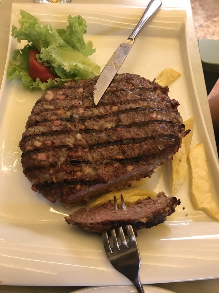 Nachdem wir um 4 bzw. 5 Uhr heute aufstehen mussten, steht uns jetzt erstmal der Sinn nach was ordentlichem zu Essen und eventuell einer kleinen Siesta. Im vom Hotel empfohlene Old City Restaurant stärken wir uns mit Schopska- und Mazedonischen-Salat, Ayjar, Brot, gefüllten und frittierten Paprikas und einem riesigen Burger-Patty gemischt mit Käse und Prosciutto. Dazu natürlich Bier, welches das deutsche Reinheitsgebot wohl nicht überleben würde, und einem abschließenden Rakija zum Magenaufräumen. Das Zeug schmeckt und kommt direkt aus der Hölle. 😉