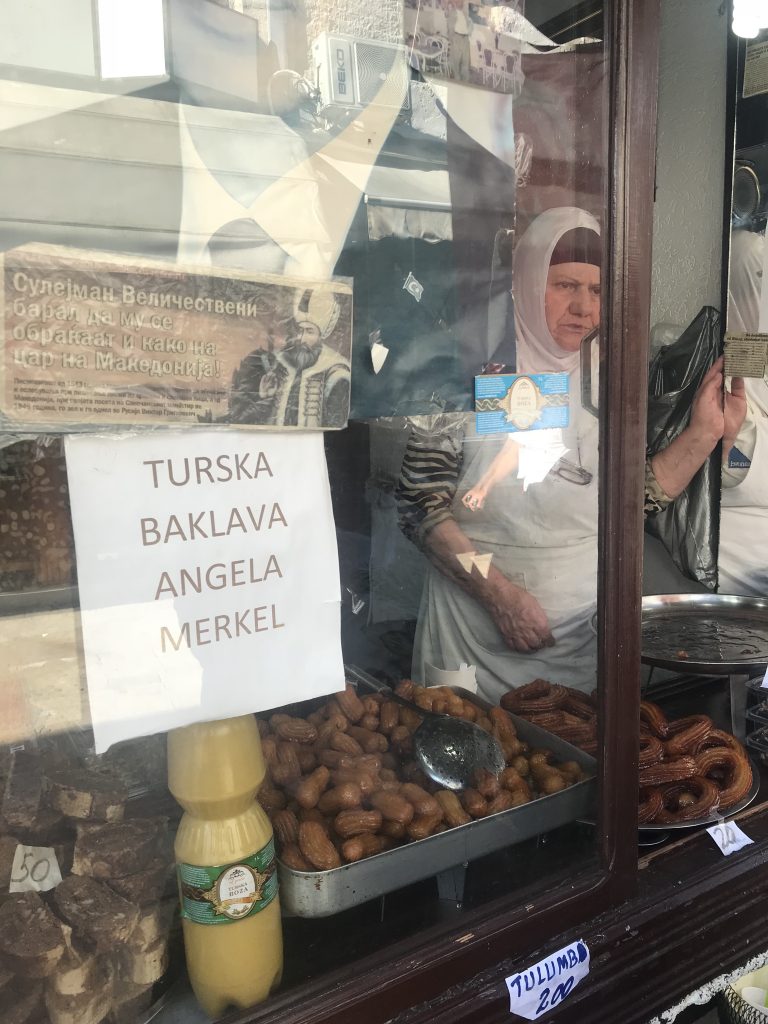 ….besteht aus den Ruinen des Schlosses und dem Basar. Auf dem Weg zu den Schloßruinen, zeigt uns Zoran seine Lieblingsstraße im Basarviertel. Hier gibt es eine tolle Süßigkeitenstube, die wir unbedingt probieren sollen. Die Inhaberin ist ein Fan unserer Kanzlerin und so gibt es hier die einzigen Angela Merkel-Baklava weltweit :-).