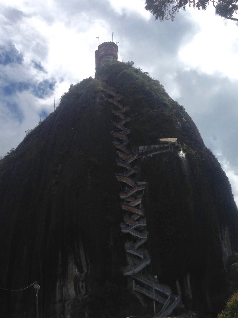Das Gebiet ist ein riesig angelegter Stausee, auf dem sich viele kleine Inseln befinden. Wunderschön anzublicken vom Piedra del Peñol, einem Granit-Monolithen der scheinbar aus dem Nichts plötzlich auftaucht. Nach 659 Stufen befinden wir uns auf der ersten Plattform und belohnen uns mit einem Eis am Stiel – hmmmm, Ananas-Cocos-Geschmack!