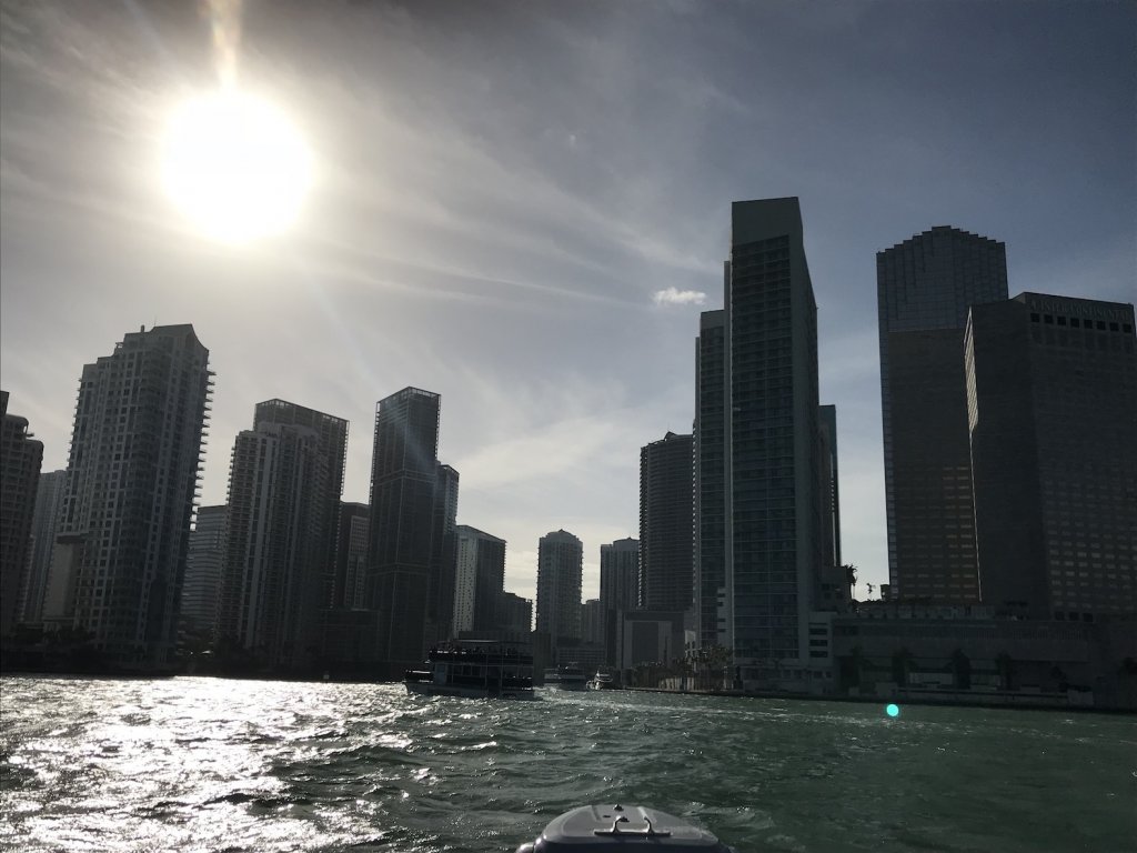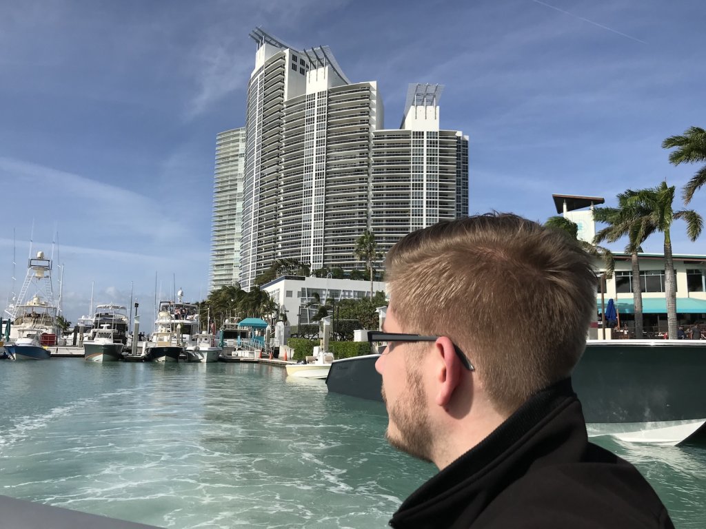 Am Nachmittag erkunden wir Miami mit dem Boot. Auf einer 2-stündigen Spritztour durch die Biscayne Bay cruisen wir von einer High Society Insel zur nächsten, am Frachthafen vorbei, bis ins Herz von Downtown Miami. Die Welt der Reichen und Schönen zeigt sich uns in ihrer perversen Pracht. Dieser Luxus ist unfassbar – Villen, Yachten so groß wie Häuser mit Helikopterlandeplätzen, Wohnanlagen, in denen nicht nur schnöde 2-3 Zimmer Appartements vermietet werden, nein, wer hier mietet, mietet die ganze Etage, natürlich mit Schiffsanlegestelle.