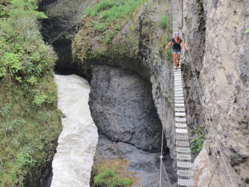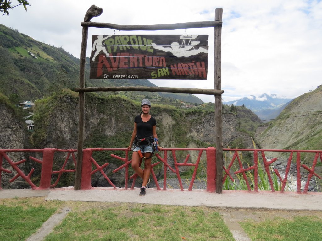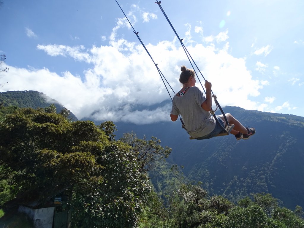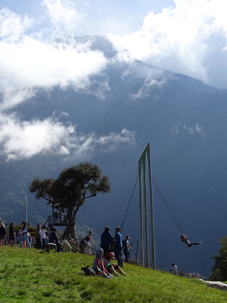 Am Mirador de la Virgen machen ich den ersten Stopp und schaue mit einigem Respekt zu, wie sich drei Touristen (natürlich Jungs) wagemutig auf eine doch recht provisorisch aussehende Himmelsschaukel setzen und über einem steilen Abhang über Baños schweben. Eigentlich ist so eine Himmelsschaukel genau mein Ziel heute, aber auf diese hier…nein, das traue ich mich nicht.