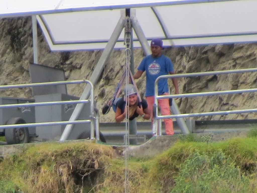 Die erste Zip-Lining Strecke geht auf dem Bauchliegend quer über den Canyon, über den doch ganz schön schnell dahinfließenden Fluß…während ich da so in der Bauchmatte liege, wird mir doch etwas flau im Magen, aber als es dann los geht ist es eher wie ein netter entspannter Flug. Kurz vor Ende nehme ich dann doch ordentlich fahrt auf und die Felswand kommt bedrohlich schnell auf mich zu. Und Zack – werde ich mit einem heftigen Ruck zurückgeworfen und lande auf der vorgesehenen Empore.