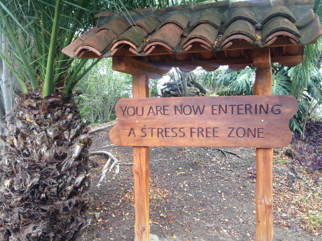 Bereits am Eingang verkündete ein großes Schild „You are now entering a stressfree Zone“ – prima, hier bin ich richtig! Ich war viel zu früh dran und hatte so den kolossalen Ausblick von der Terrasse ganz für mich allein. Morgenstund hat Gold im Mund und so wollte ich bei einer schönen, heissen Tasse Kaffee schnell meinen Blogartikel zu Galapagos finalisieren und online stellen.