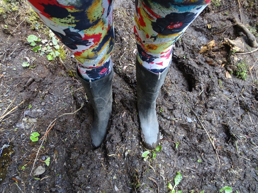 Nichts destotrotz setzte ich mich einmal komplett im Matsch auf den Hosenboden. Aber das tat der Stimmung keinen Abbruch und munter ging es weiter, immer von rechts nach links, über und durch den Fluß, wozu hatte ich denn sonst Gummistiefel an. An naßen Felswänden und -vorsprüngen kletterten und zogen wir uns hoch und standen nach einer knappen Stunde vor dem Wasserfall.