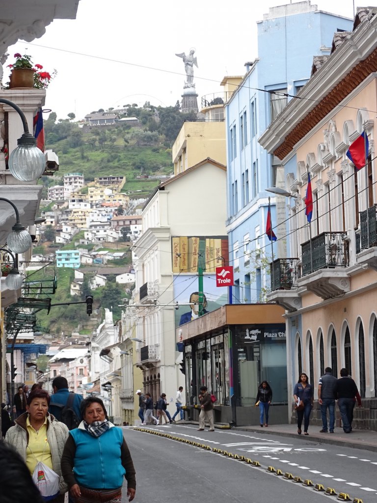 Als wir einfuhren durchbrachen gerade vereinzelte Sonnenstrahlen die dicken, dunklen Wolken und ließen die Jungfrau Maria, die Schutzheilige Ecuadors, 45m hoch und die einzige Marienstatue mit Flügeln, in einem geradezu göttlichen Licht erstrahlen.