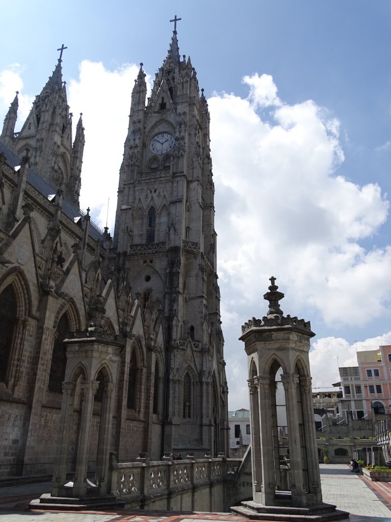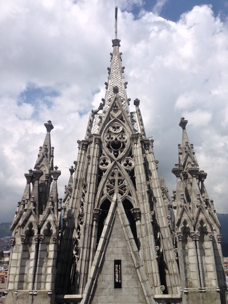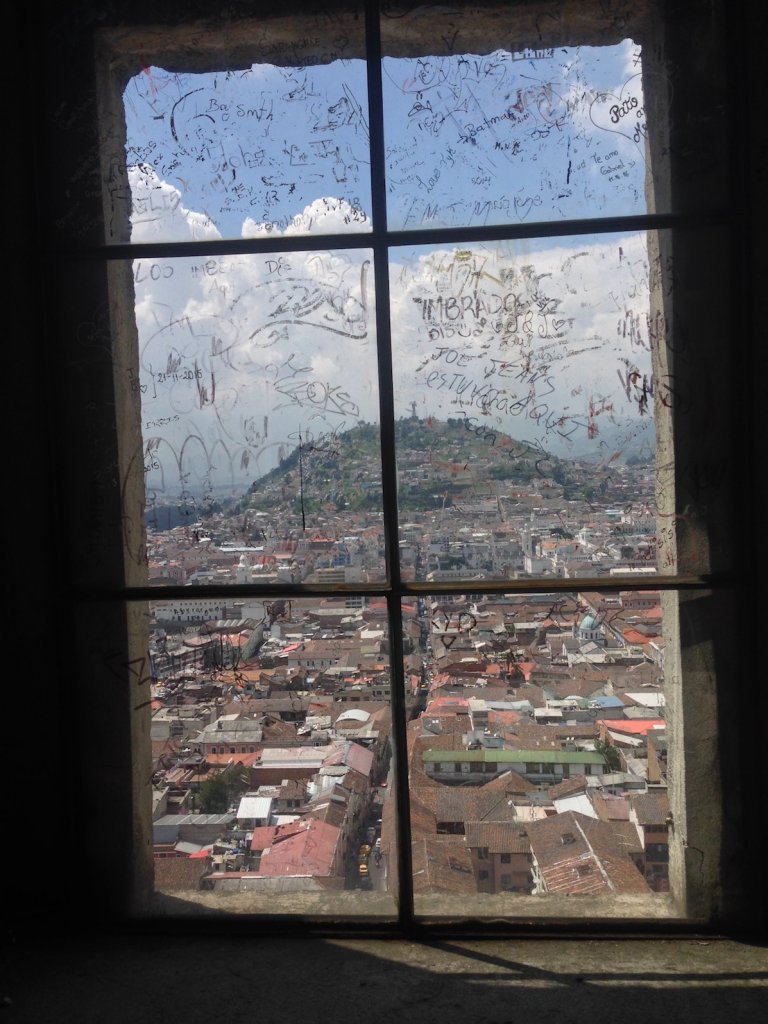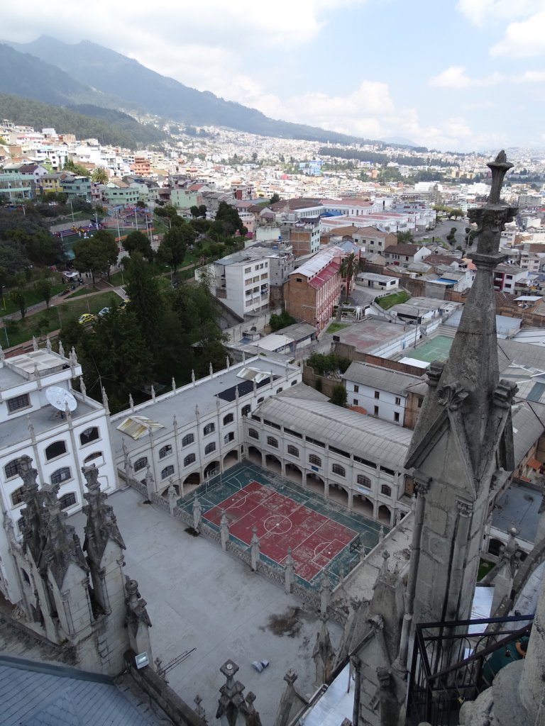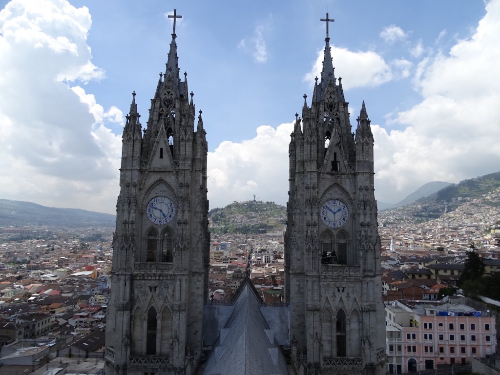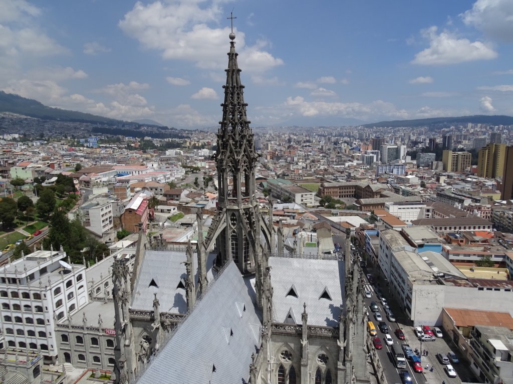 Tag 2 – wieder strahlender Sonnenschein. Damit ich so viel wie möglich von der Stadt sehe entschließe ich mich mit dem Hop on-Hop off Bus zu fahren und erwische einen im Mariscal- Viertel. Mein erster großer Stop ist die Basilica, die aus der Altstadt herausragt. Ich will so hoch hinaus wie es geht…und werde mit einem 360° Blick auf Quito belohnt.