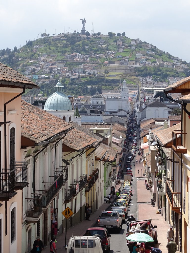 Nach einer Stunde geht es mit dem Bus durch die engen Gassen und Straßen der Altstadt zum El Panecillo (deutsch das Brötchen – ???), dem Hügel, auf dem die Jungfrau Maria über Quito und Ecuador wacht. Auch hier gibt es wieder Aussichten en masse.