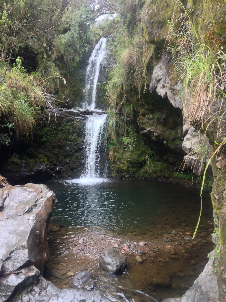 Dass mich in Ecuador der Regen wieder eingeholt hat habe ich schon erwähnt, oder? Mit uns kam auch der Regen im Secret Garden an. Also nix wie rein in die gute Stube, am Kamin aufwärmen, Glühwein schlürfen und hoffen, dass sich der Regen bis zu unserer ersten Wanderung zum Wasserfall wieder verzieht. Und während wir uns alle schon in Gummistiefel schmissen und die mehr oder weniger professionelle Regenkleidung überzogen (mit meinem vietnamesischen Regenponcho in weiß mit pinken Punkten gewann ich definitiv den Auffälligkeitspreis, ansonsten hat er diesen Aufenthalt leider nicht überlebt und musste zurückgelassen werden) hörte es tatsächlich auf zu Regnen und wir stapften über die Weiden Richtung Wald – bergauf natürlich, is klar! Ich war erstaunt, wie viel Stabilität ich mit den Gummistiefel hatte und nach den ersten Matschpfützen und kleineren Kletteraktionen war ich froh, nicht meine Turnschuhe anzuhaben.