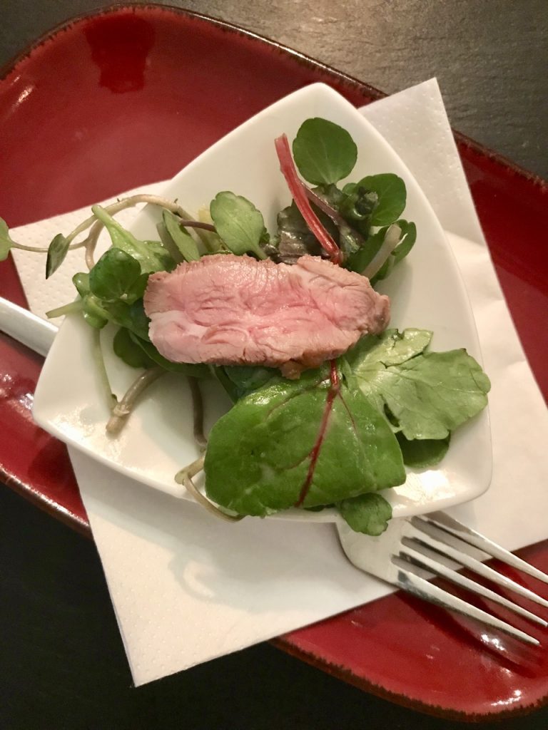 Der Gruß aus der Küche war schon ein vielversprechendes Lammfilet an Wildkräutersalat. Zur Vorspeise wurde ein Carpaccio vom Dry Age Rind an Trüffelöl und für mich die geeiste Teltower Rübchensuppe mt Fenchelsorbet kredenzt. Letztere entpuppte sich als ein Traum in weiß – ähnlich einem Schneegestöber und war wirklich lecker. Das Fenchelsorbet war geschmacklich etwas vollkommen Neues; leichte Süße, sehr frostig – am Ende hat mir das typische Fenchelaroma gefehlt – aber die Kombi und die Idee war Klasse. Vor allem für den Sommer 2018.