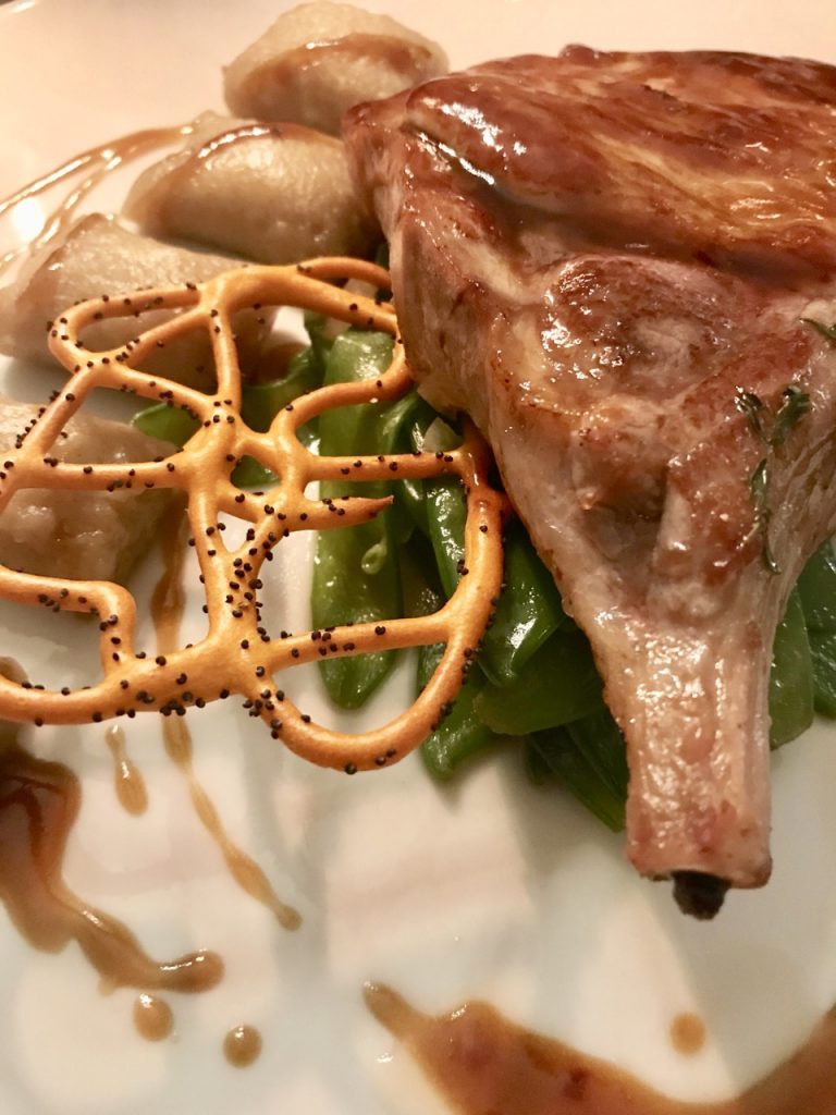 Unter den 8 Hauptspeisen gab es eine gute Auswahl an Geflügel (u.a. auch Taube), Rind und Schwein, Fisch und auch ein vegetarisches Gericht. Wir entschieden uns für die Kalbsbacke mit Serviettenknödel und das Seelower Schweinekotelett mit Steinpilzgnocchis. Zu beiden Gerichten wurde als Gemüse der Saison, unglaublich lecker angerichtete, Zuckerschoten serviert.