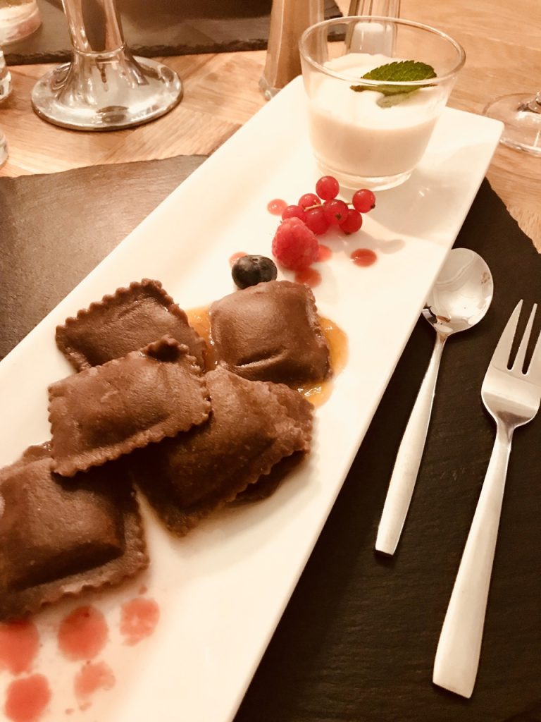 Ein Dessert musste noch sein. Dafür war die Atmosphäre, der Service und alles drum herum wie geschaffen. Neben den drei Angeboten auf der Karte, wurde uns noch ein Fruchtsorbet auf Champagner empfohlen. Perfekt – und einmal die Schokoladenravioli bitte!