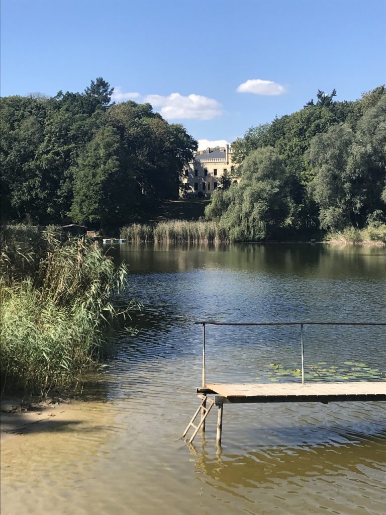 Vor uns tat sich ein wirklich imposanter Blick auf. Das, sehr gut erhaltene, sandfarbene Schloss, inmitten einer, bis dahin nur zu erahnenden, großen Parkanlage und kurz blitzte auch das Blau des dahinter liegenden „Langen Sees“ auf. Pures Vorfreude!