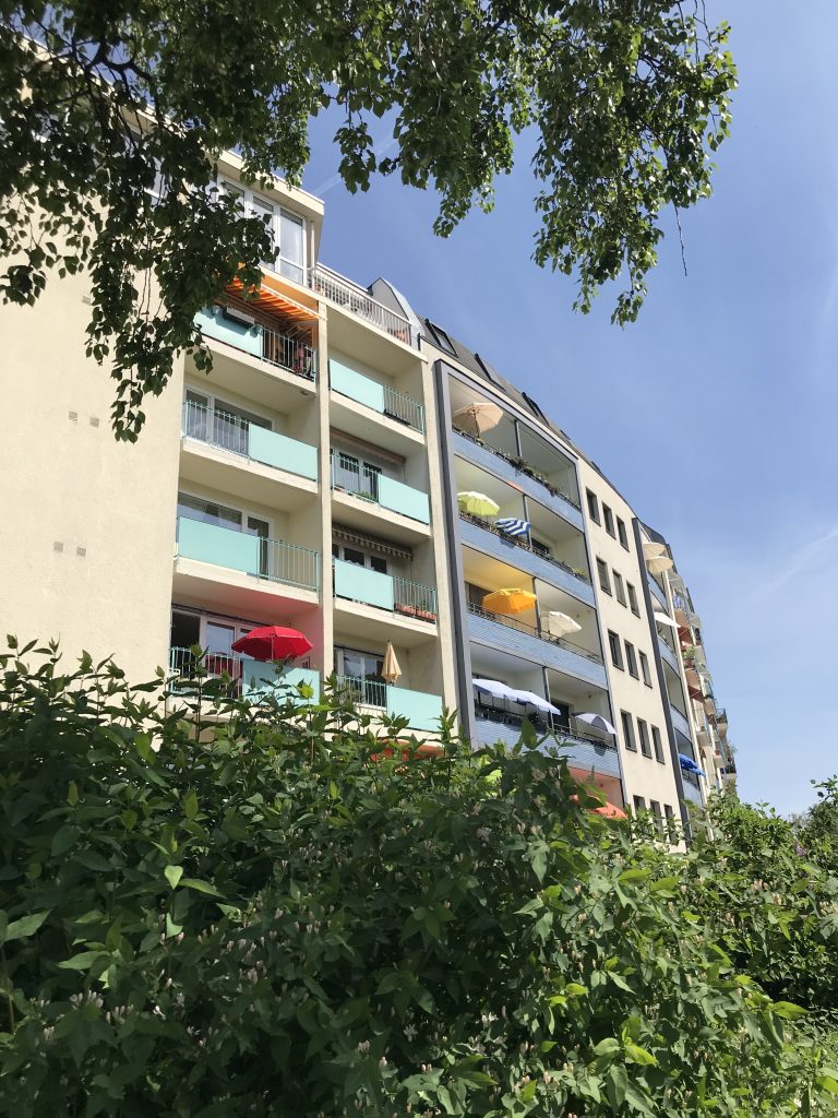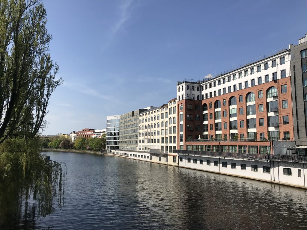 Auf Höhe Osnabrücker Str. geht ein kleiner Spazierpfad ab und führt weg win der Hauptstraße wieder direkt an die Spree weiter zur Schloßbrücke. Lustig ist ein Blick nach oben, wo kunterbunte Sonnenschirme auf den Balkonen ein farbenfrohes Bild abgeben. Wir wechseln auf der Schloßbrücke die Seite, um weiterhin an der Spree entlang zu laufen zu unserem nächsten Ziel.