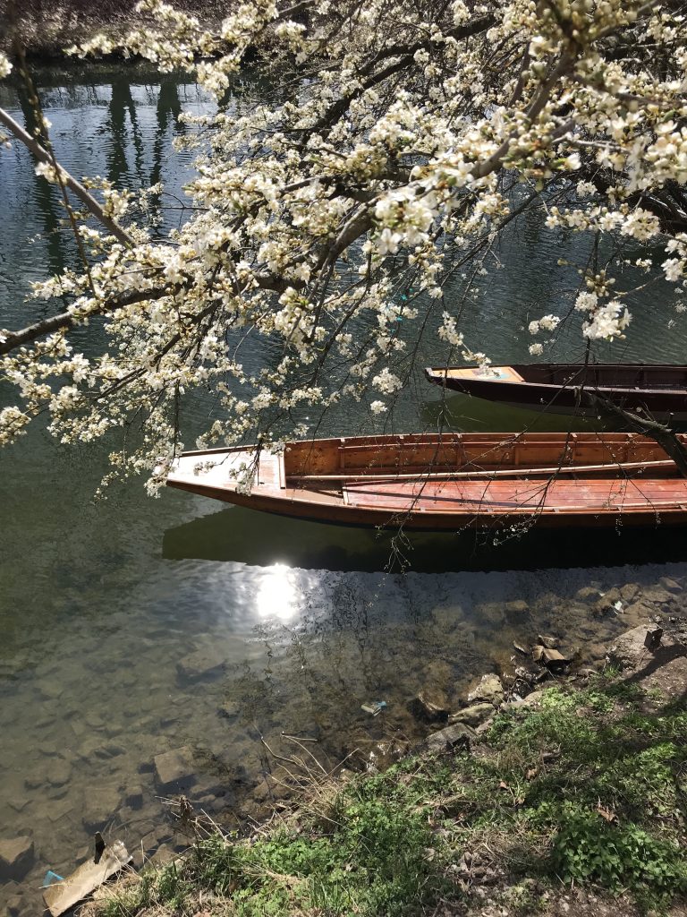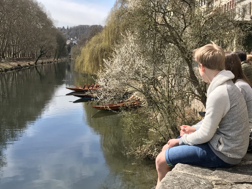 An und auf der Neckarmauer herrscht Hochbetrieb. Klar, denn jeder, ob Groß und Klein, nutzt die ersten wärmenden Sonnenstrahlen und hält sein Gesicht in die Sonne. Abgesehen von dem schönen sonnigen Plätzchen, hinterlassen der Blick über den Neckar, die wunderschönen alten Häuser hinter uns und die erblühenden Obstbäume überall ein super entspanntes Urlaubsfeeling.