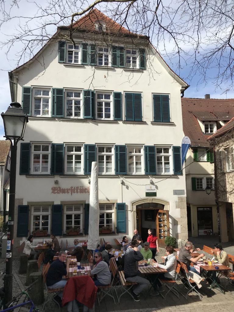 Langsam werden die Füße etwas müde und die Kehle durstig. Wir stärken uns mit einem Bier im Frau Hopf, einem Café/ Kneipe, welche auch Livemusik anbietet. Es liegt direkt am Eingang zum Schloß vis á vis dem Mauganeschtle. Eigentlich wollte ich dort unbedingt die für Tübingen bekannten Maultaschen probieren. Aber leider ist das Restaurant am Nachmittag geschlossen.